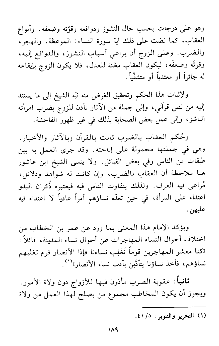 ولإثبات هذا الحكم وتحقيق الغرض منه نبّه الشيخ إلى ما يستند إليه من نص قرآني، وإلى جملة من الآثار تأذن للزوج بضرب امرأته الناشز، وإلى عمل بعض الصحابة بذلك في غير ظهور الفاحشة.
