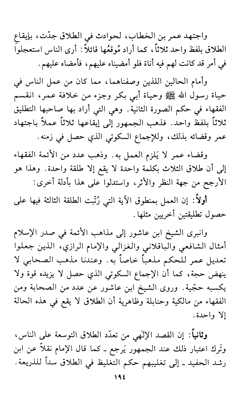 وقضاء عمر لا يَلزم العمل به. وذهب عدد من الأئمة الفقهاء إلى أن طلاق الثلاث بكلمة واحدة لا يقع إلا طلقة واحدة. وهذا هو الأرجح من جهة النظر والأثر، واستدلوا على هذا بأدلة أخرى: