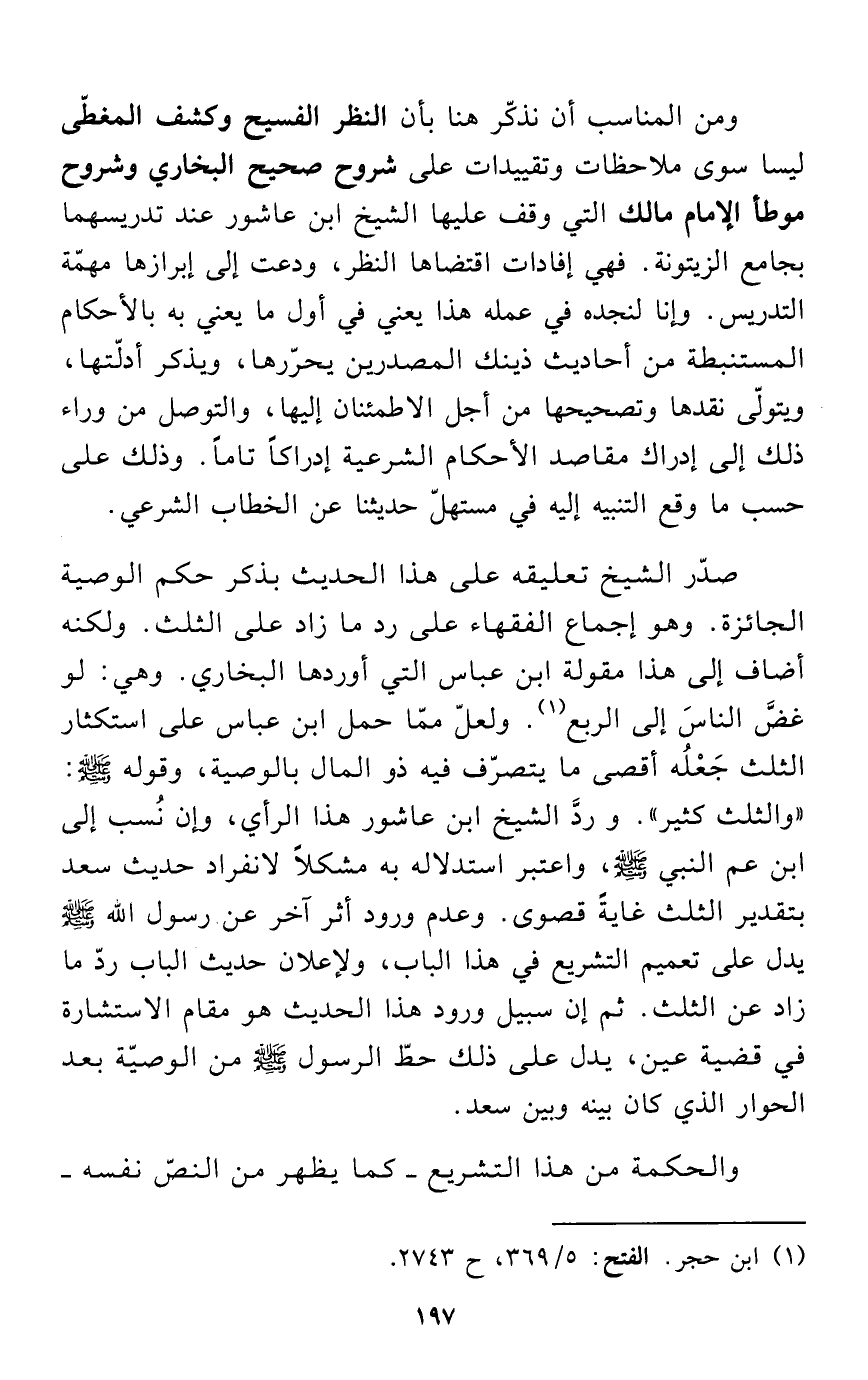 صدّر الشيخ تعليقه على هذا الحديث بذكر حكم الوصية الجائزة. وهو إجماع الفقهاء على رد ما زاد على الثلث. ولكنه أضاف إلى هذا مقولة ابن عباس التي أوردها البخاري. وهي: لو غضَّ الناسَ إلى الربع (¬1). ولعلّ ممّا حمل ابن عباس على استكثار الثلث جَعلُه أقصى ما يتصرّف فيه ذو المال بالوصية، وقوله - صلى الله عليه وسلم -: "والثلث كثير". وردَّ الشيخ ابن عاشور هذا الرأي، وإن نُسب إلى ابن عم النبي - صلى الله عليه وسلم -، واعتبر استدلاله به مشكلاً لانفراد حديث سعد بتقدير الثلث غايةً قصوى. وعدم ورود أثر آخر عن رسول الله - صلى الله عليه وسلم - يدل على تعميم التشريع في هذا الباب، ولإعلان حديث الباب ردّ ما زاد عن الثلث. ثم إن سبيل ورود هذا الحديث هو مقام الاستشارة في قضية عين، يدل على ذلك حطّ الرسول - صلى الله عليه وسلم - من الوصيّة بعد الحوار الذي كان بينه وبين سعد.