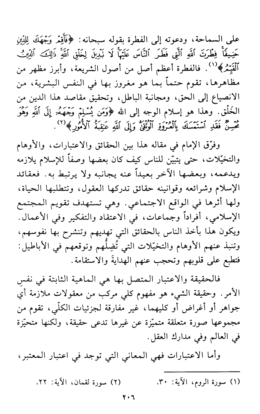 وفرّق الإمام في مقاله هذا بين الحقائق والاعتبارات، والأوهام والتخيّلات، حتى يتبيّن للناس كيف كان بعضها وصفاً للإسلام يلازمه ويدعمه، وبعضها الآخر بعيداً عنه يجانبه ولا يرتبط به. فعقائد الإسلام وشرائعه وقوانينه حقائق تدركها العقول، وتتطلبها الحياة، ولها أثرها في الواقع الاجتماعي. وهي تستهدف تقويم المجتمع الإسلامي، أفراداً وجماعات، في الاعتقاد والتفكير وفي الأعمال. ويكون هذا بأخذ الناس بالحقائق التي تهديهم وتنشرح بها نفوسهم، وتنبذ عنهم الأوهام والتخيّلات التي تُضِلُّهم وتوقعهم في الأباطيل: فتطبع على قلوبهم وتحجب عنهم الهدايةَ والاستقامة.