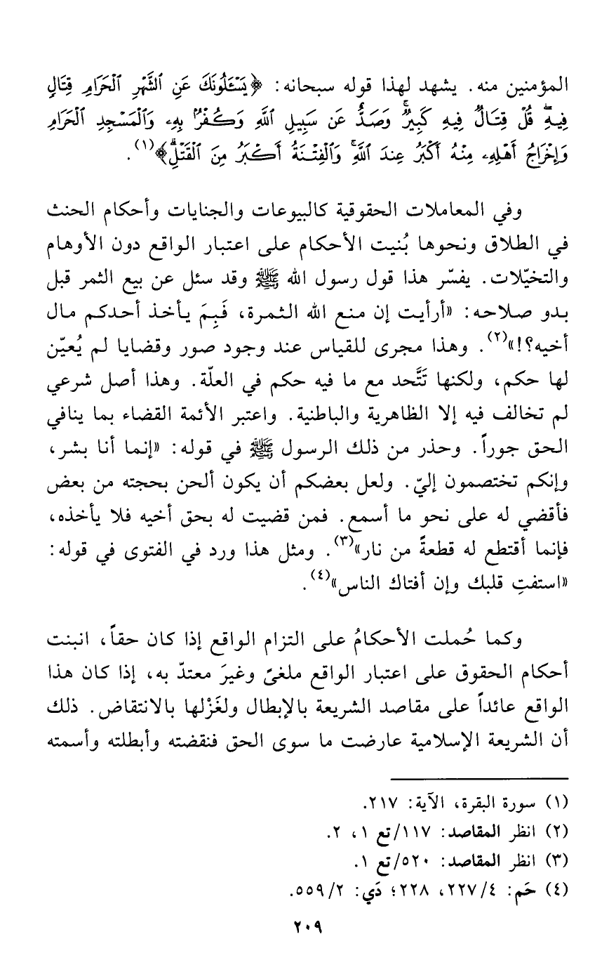وفي المعاملات الحقوقية كالبيوعات والجنايات وأحكام الحنث في الطلاق ونحوها بُنيت الأحكام على اعتبار الواقع دون الأوهام والتخيّلات. يفسّر هذا قول رسول الله - صلى الله عليه وسلم - وقد سئل عن بيع الثمر قبل بدو صلاحه: "أرأيت إن منع الله الثمرة، فَبِمَ يأخذ أحدكم مال أخيه؟! " (¬2). وهذا مجرى للقياس عند وجود صور وقضايا لم يُعيّن لها حكم، ولكنها تَتَّحد مع ما فيه حكم في العلّة. وهذا أصل شرعي لم تخالف فيه إلا الظاهرية والباطنية. واعتبر الأئمة القضاء بما ينافي الحق جوراً. وحذر من ذلك الرسول - صلى الله عليه وسلم - في قوله: "إنما أنا بشر، وإنكم تختصمون إليّ. ولعل بعضكم أن يكون ألحن بحجته من بعض فأقضي له على نحو ما أسمع. فمن قضيت له بحق أخيه فلا يأخذه، فإنما أقتطع له قطعةً من نار" (¬3). ومثل هذا ورد في الفتوى في قوله: "استفتِ قلبك وإن أفتاك الناس" (¬4).