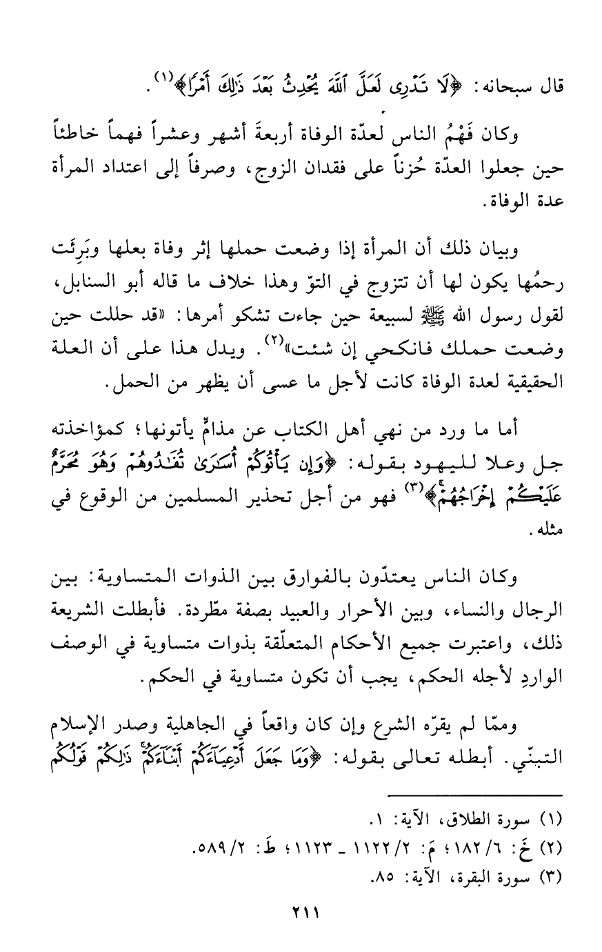 وبيان ذلك أن المرأة إذا وضعت حملها إثر وفاة بعلها وبَرِئَت رحمُها يكون لها أن تتزوج في التوّ وهذا خلاف ما قاله أبو السنابل، لقول رسول الله - صلى الله عليه وسلم - لسبيعة حين جاءت تشكو أمرها: "قد حللت حين وضعت حملك فانكحي إن شئت" (¬2). ويدل هذا على أن العلة الحقيقية لعدة الوفاة كانت لأجل ما عسى أن يظهر من الحمل.