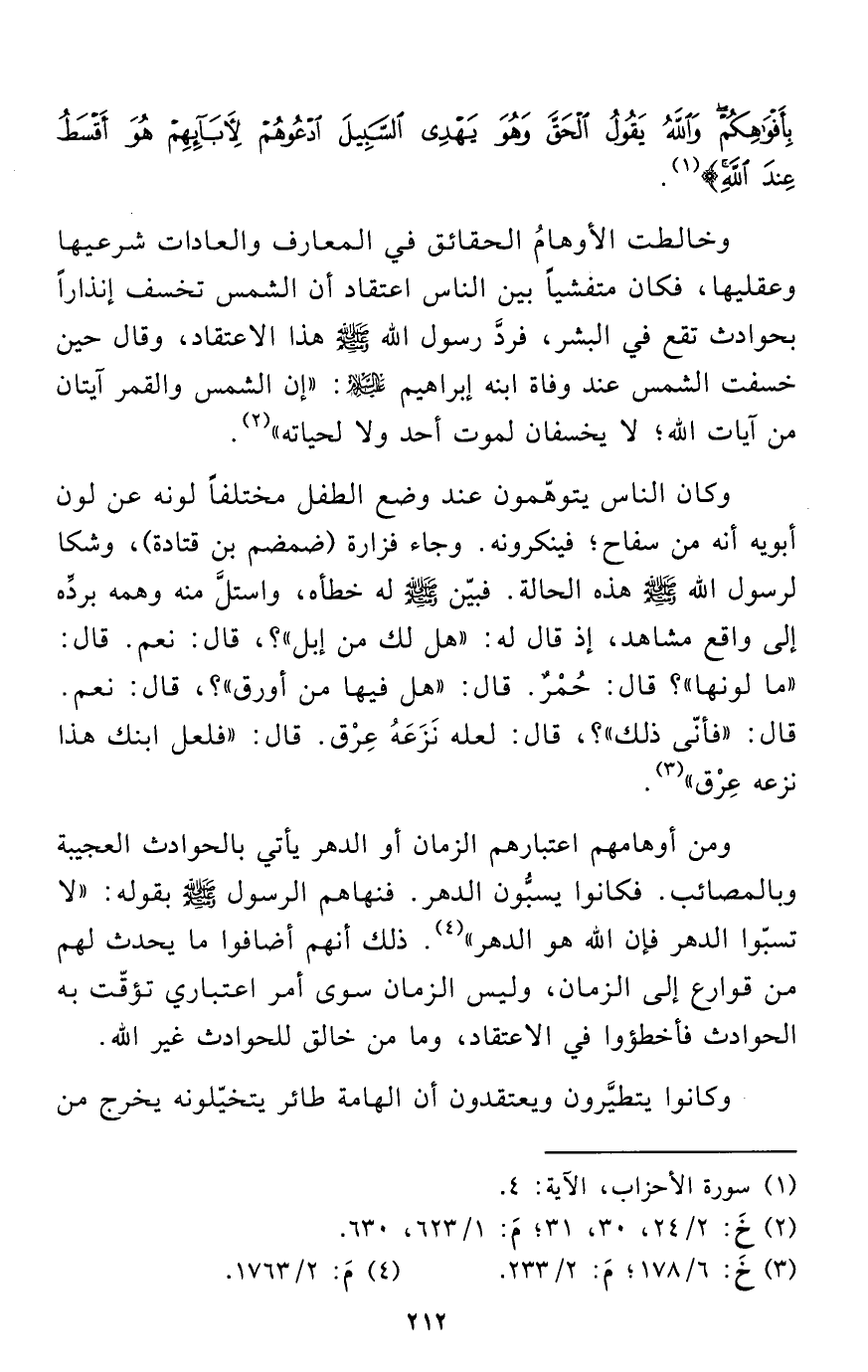 ومن أوهامهم اعتبارهم الزمان أو الدهر يأتي بالحوادث العجيبة وبالمصائب. فكانوا يسبُّون الدهر. فنهاهم الرسول - صلى الله عليه وسلم - بقوله: "لا تسبّوا الدهر فإن الله هو الدهر" (¬4). ذلك أنهم أضافوا ما يحدث لهم من قوارع إلى الزمان، وليس الزمان سوى أمر اعتباري تؤقّت به الحوادث فأخطؤوا في الاعتقاد، وما من خالق للحوادث غير الله.