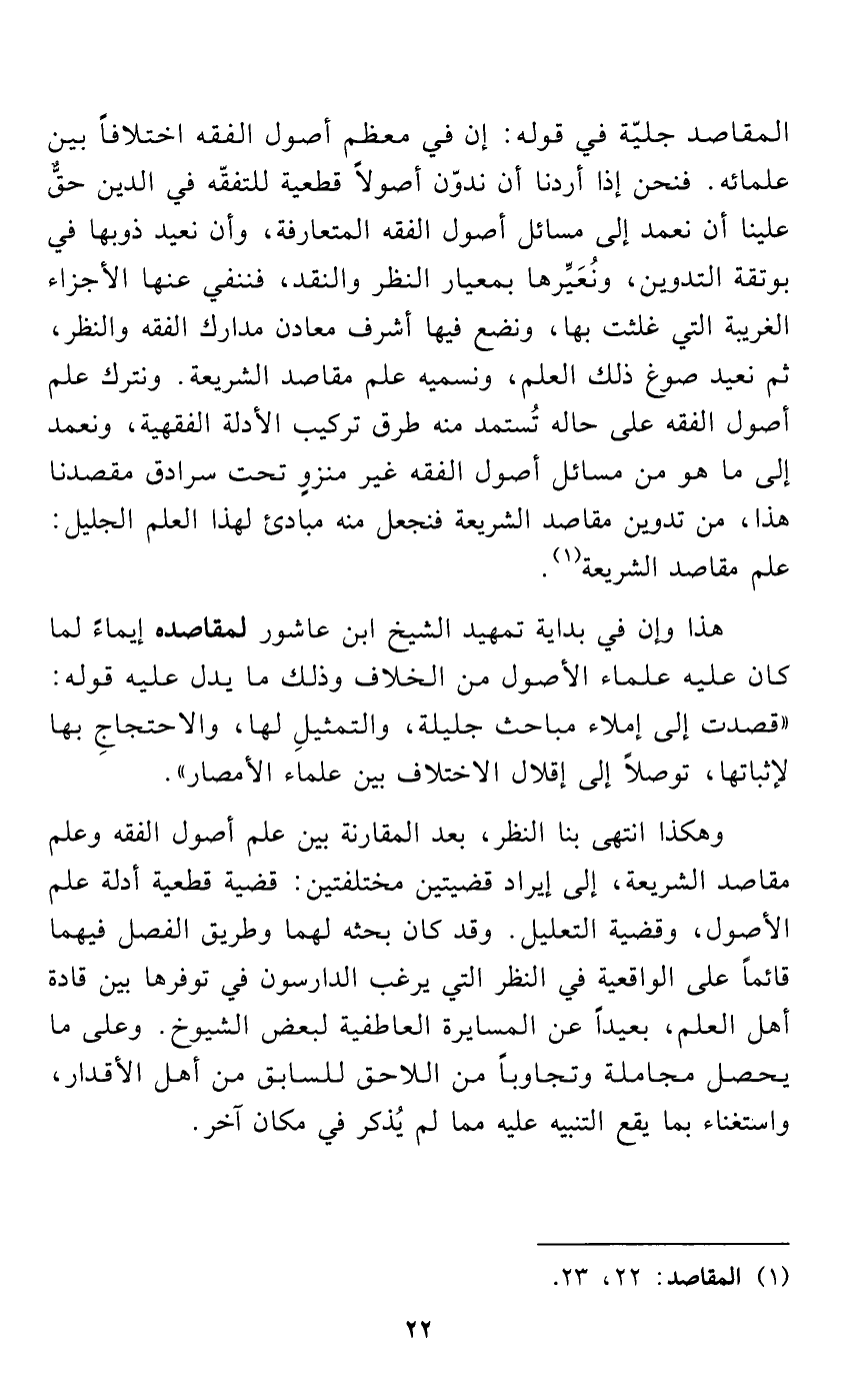 وهكذا انتهى بنا النظر، بعد المقارنة بين علم أصول الفقه وعلم مقاصد الشريعة، إلى إيراد قضيتين مختلفتين: قضية قطعية أدلة علم الأصول، وقضية التعليل. وقد كان بحثه لهما وطريق الفصل فيهما قائماً على الواقعية في النظر التي يرغب الدارسون في توفرها بين قادة أهل العلم، بعيداً عن المسايرة العاطفية لبعض الشيوخ. وعلى ما يحصل مجاملة وتجاوباً من اللاحق للسابق من أهل الأقدار، واشتغناء بما يقع التنبيه عليه مما لم يُذكر في مكان آخر.