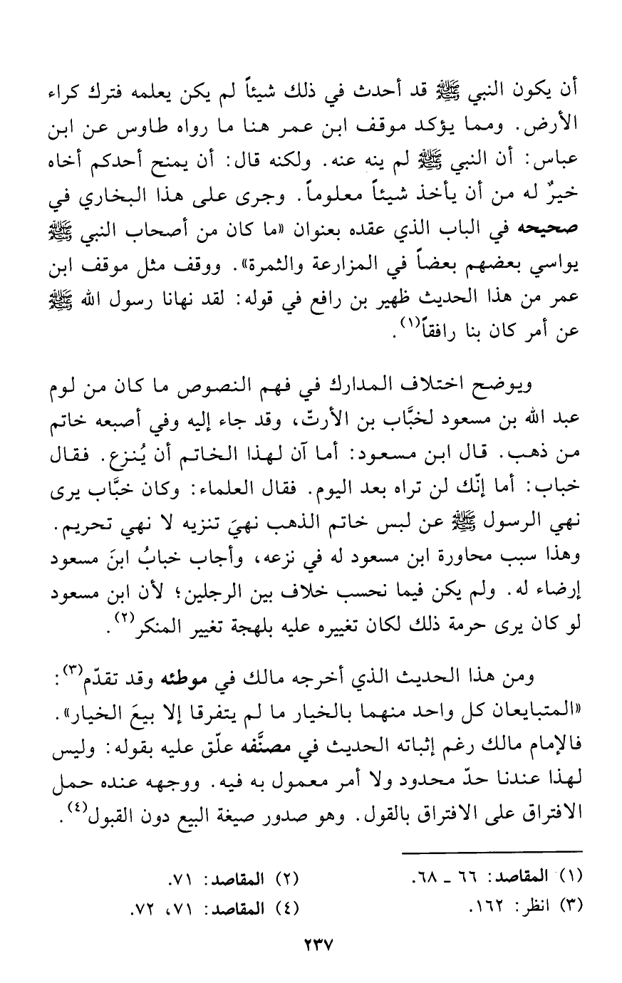 أن يكون النبي - صلى الله عليه وسلم - قد أحدث في ذلك شيئاً لم يكن يعلمه فترك كراء الأرض. ومما يؤكد موقف ابن عمر هنا ما رواه طاوس عن ابن عباس: أن النبي - صلى الله عليه وسلم - لم ينه عنه. ولكنه قال: أن يمنح أحدكم أخاه خيرٌ له من أن يأخذ شيئاً معلوماً. وجرى على هذا البخاري في صحيحه في الباب الذي عقده بعنوان "ما كان من أصحاب النبي - صلى الله عليه وسلم - يواسي بعضهم بعضاً في المزارعة والثمرة". ووقف مثل موقف ابن عمر من هذا الحديث ظهير بن رافع في قوله: لقد نهانا رسول الله - صلى الله عليه وسلم - عن أمر كان بنا رافقاً (¬1).