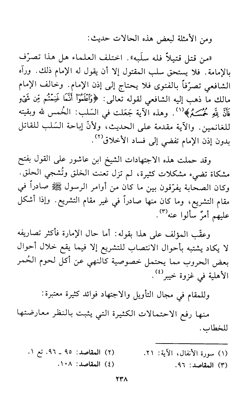 "من قتل قتيلاً فله سلَبه". اختلف العلماء هل هذا تصرّف بالإمامة. فلا يستحق سلب المقتول إلا أن يقول له الإمام ذلك. ورآه الشافعي تصرّفاً بالفتوى فلا يحتاج إلى إذن الإمام. وخالف الإمام مالك ما ذهب إليه الشافعي لقوله تعالى: {وَاعْلَمُوا أَنَّمَا غَنِمْتُمْ مِنْ شَيْءٍ فَأَنَّ لِلَّهِ خُمُسَهُ} (¬1). وهذه الآية جَعَلت في السَلب: الخُمس لله وبقيته للغانمين. والآية مقدمة على الحديث، ولأنّ إباحة السَلب للقاتل بدون إذن الإمام تفضي إلى فساد الأخلاق (¬2).