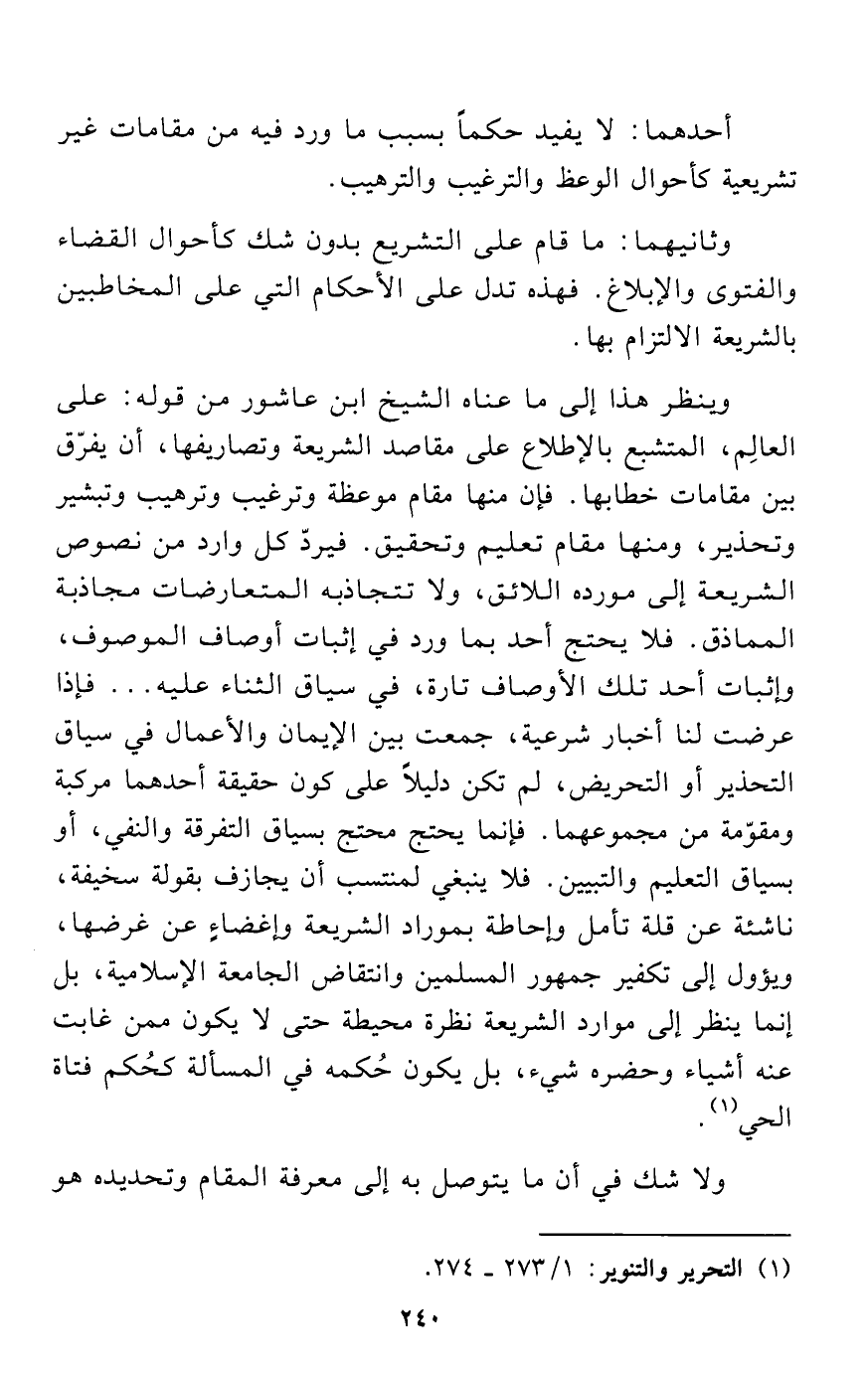 وينظر هذا إلى ما عناه الشيخ ابن عاشور من قوله: على العالِم، المتشبع بالإطلاع على مقاصد الشريعة وتصاريفها، أن يفرّق بين مقامات خطابها. فإن منها مقام موعظة وترغيب وترهيب وتبشير وتحذير، ومنها مقام تعليم وتحقيق. فيردّ كل وارد من نصوص الشريعة إلى مورده اللائق، ولا تتجاذبه المتعارضات مجاذبة المماذق. فلا يحتج أحد بما ورد في إثبات أوصاف الموصوف، وإثبات أحد تلك الأوصاف تارة، في سياق الثناء عليه ... فإذا عرضت لنا أخبار شرعية، جمعت بين الإيمان والأعمال في سياق التحذير أو التحريض، لم تكن دليلاً على كون حقيقة أحدهما مركبة ومقوّمة من مجموعهما. فإنما يحتج محتج بسياق التفرقة والنفي، أو بسياق التعليم والتبيين. فلا ينبغي لمنتسب أن يجازف بقولة سخيفة، ناشئة عن قلة تأمل وإحاطة بموراد الشريعة وإغضاءٍ عن غرضها، ويؤول إلى تكفير جمهور المسلمين وانتقاض الجامعة الإسلامية، بل إنما ينظر إلى موارد الشريعة نظرة محيطة حتى لا يكون ممن غابت عنه أشياء وحضره شيء، بل يكون حُكمه في المسألة كحُكم فتاة الحي (¬1).