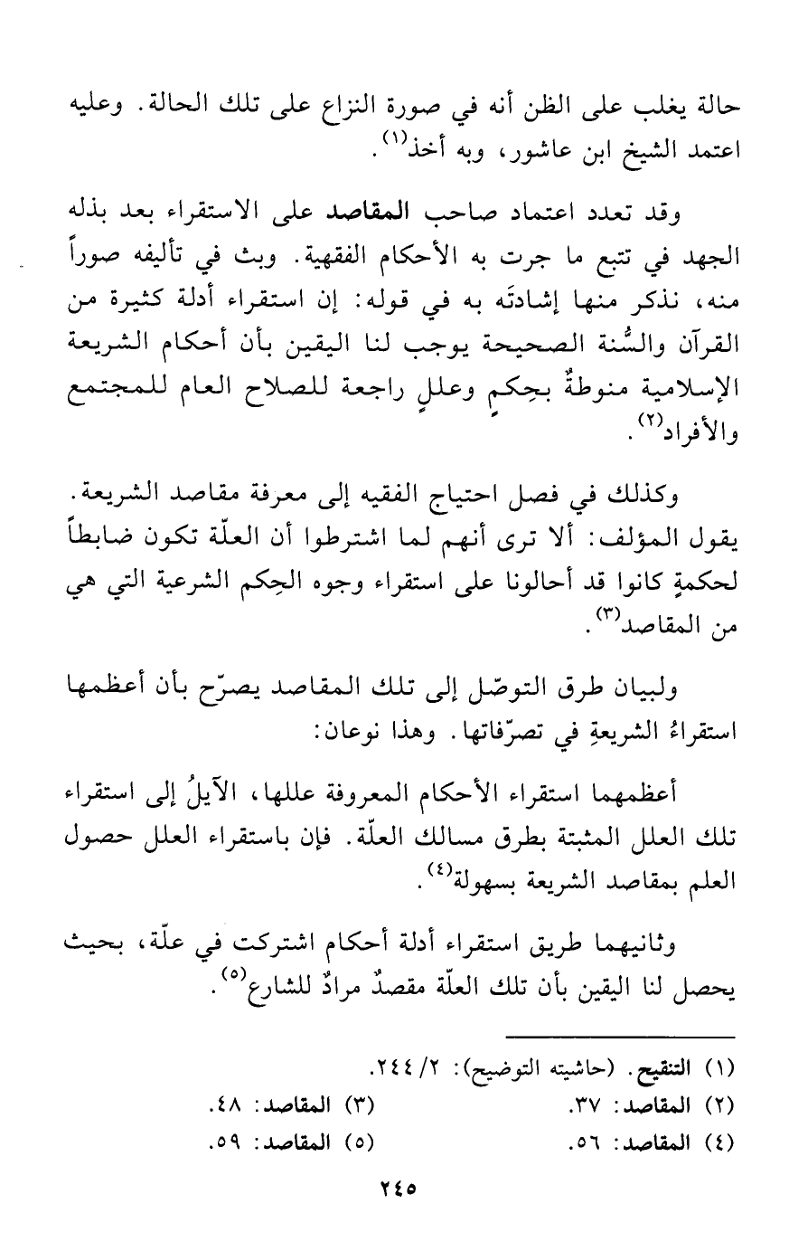 وكذلك في فصل احتياج الفقيه إلى معرفة مقاصد الشريعة. يقول المؤلف: ألا ترى أنهم لما اشترطوا أن العلّة تكون ضابطاً لحكمةٍ كانوا قد أحالونا على استقراء وجوه الحِكم الشرعية التي هي من المقاصد (¬3).