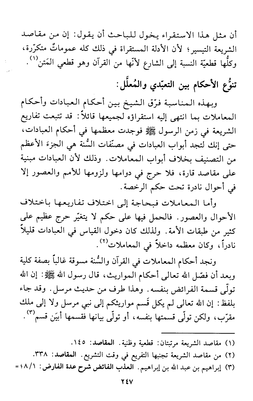 ونجد أحكام المعاملات في القرآن والسُّنة مسوقة غالباً بصفة كلية وبعد أن فصّل الله تعالى أحكام المواريث، قال رسول الله - صلى الله عليه وسلم -: إن الله تولّى قسمة الفرائض بنفسه. وهذا طرف من حديث مرسل. وقد جاء بلفظ: إن الله تعالى لم يكل قَسم مواريثكم إلى نبي مرسل ولا إلى ملك مقرّب، ولكن تولّى قسمتها بنفسه، أو تولّى بيانها فقسمها أبيَن قسم (¬3).