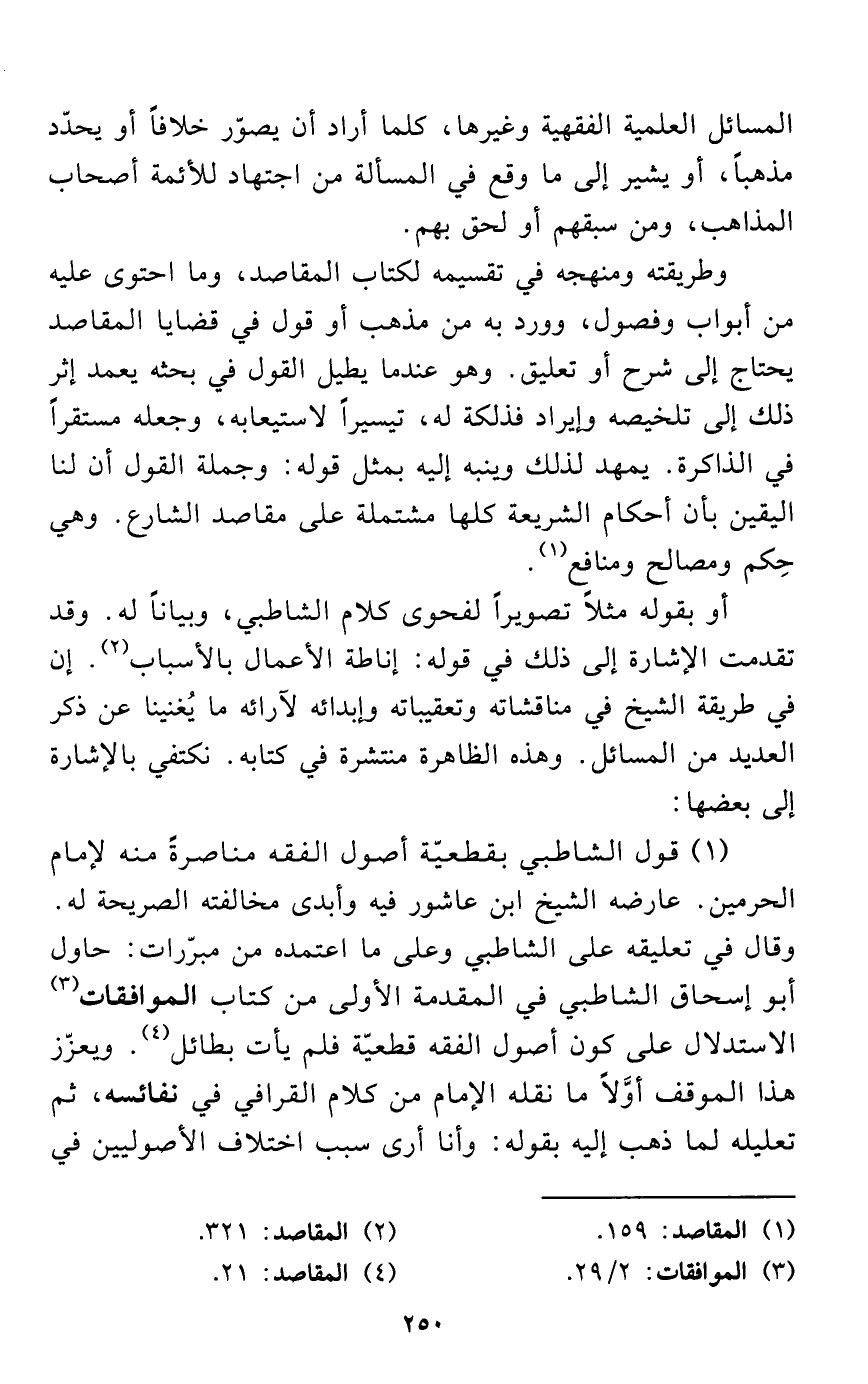 وطريقته ومنهجه في تقسيمه لكتاب المقاصد، وما احتوى عليه من أبواب وفصول، وورد به من مذهب أو قول في قضايا المقاصد يحتاج إلى شرح أو تعليق. وهو عندما يطيل القول في بحثه يعمد إثر ذلك إلى تلخيصه وإيراد فذلكة له، تيسيراً لاستيعابه، وجعله مستقراً في الذاكرة. يمهد لذلك وينبه إليه بمثل قوله: وجملة القول أن لنا اليقين بأن أحكام الشريعة كلها مشتملة على مقاصد الشارع. وهي حِكم ومصالح ومنافع (¬1).