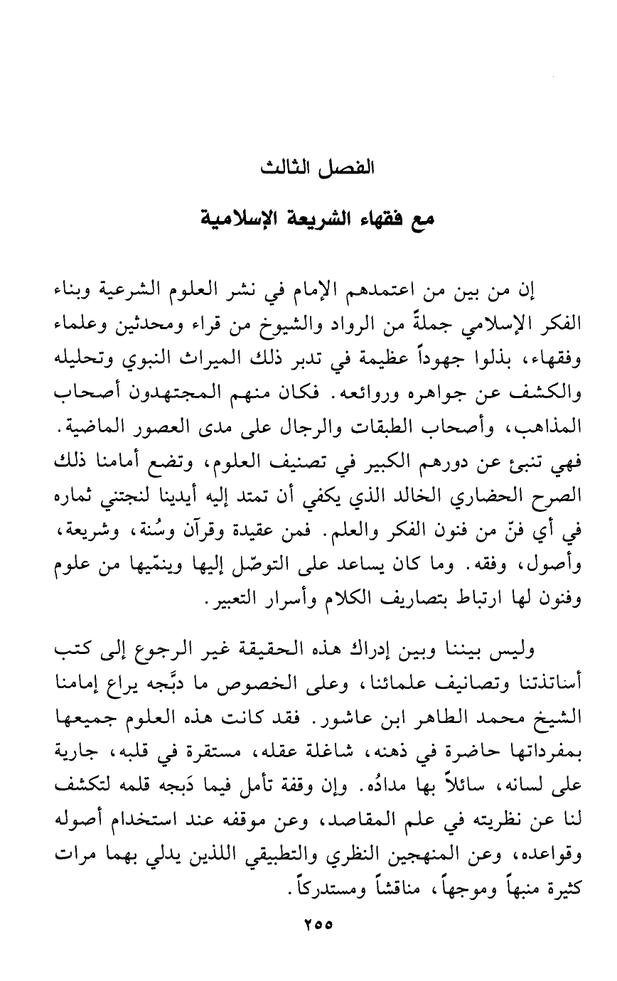 وليس بيننا وبين إدراك هذه الحقيقة غير الرجوع إلى كتب أساتذتنا وتصانيف علمائنا، وعلى الخصوص ما دبَّجه يراع إمامنا الشيخ محمد الطاهر ابن عاشور. فقد كانت هذه العلوم جميعها بمفرداتها حاضرة في ذهنه، شاغلة عقله، مستقرة في قلبه، جارية على لسانه، سائلاً بها مدادُه. وإن وقفة تأمل فيما دَبجه قلمه لتكشف لنا عن نظريته في علم المقاصد، وعن موقفه عند استخدام أصوله وقواعده، وعن المنهجين النظري والتطبيقي اللذين يدلي بهما مرات كثيرة منبهاً وموجهاً، مناقشاً ومستدركاً.