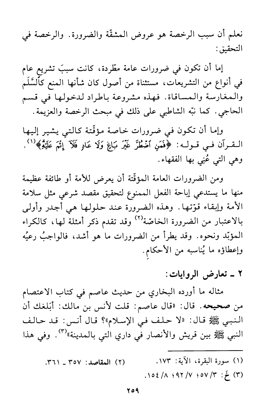 وإما أن تكون في ضرورات خاصة مؤقّتة كالتي يشير إليها القرآن في قوله: {فَمَنِ اضْطُرَّ غَيْرَ بَاغٍ وَلَا عَادٍ فَلَا إِثْمَ عَلَيْهِ} (¬1). وهي التي عُنِي بها الفقهاء.
