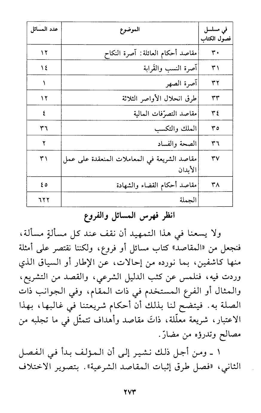 ولا يسعنا في هذا التمهيد أن نقف عند كل مسألةٍ مسألة، فنجعل من "المقاصد" كتاب مسائل أو فروع، ولكننا نقتصر على أمثلة منها كاشفين، بما نورده من إحالات، عن الإطار أو السياق الذي وردت فيه، فنلمس عن كثب الدليل الشرعي، والقصد من التشريع، والمثال أو الفرع المستخدم في ذات المقام، وفي الجوانب ذات الصلة به. فيتضح لنا بذلك أن أحكام شريعتنا في غالبها، بهذا الاعتبار، شريعة معلّلة، ذاتَ مقاصد وأهداف تتمثّل في ما تجلبه من مصالح وتدرؤه من مضارّ.