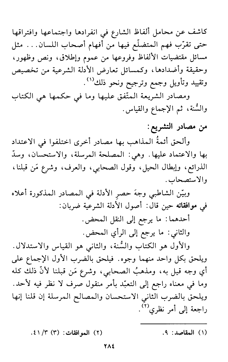 وبيّن الشاطبي وجهَ حصرِ الأدلة في المصادر المذكورة أعلاه في موافقاته حين قال: أصول الأدلة الشرعية ضربان: