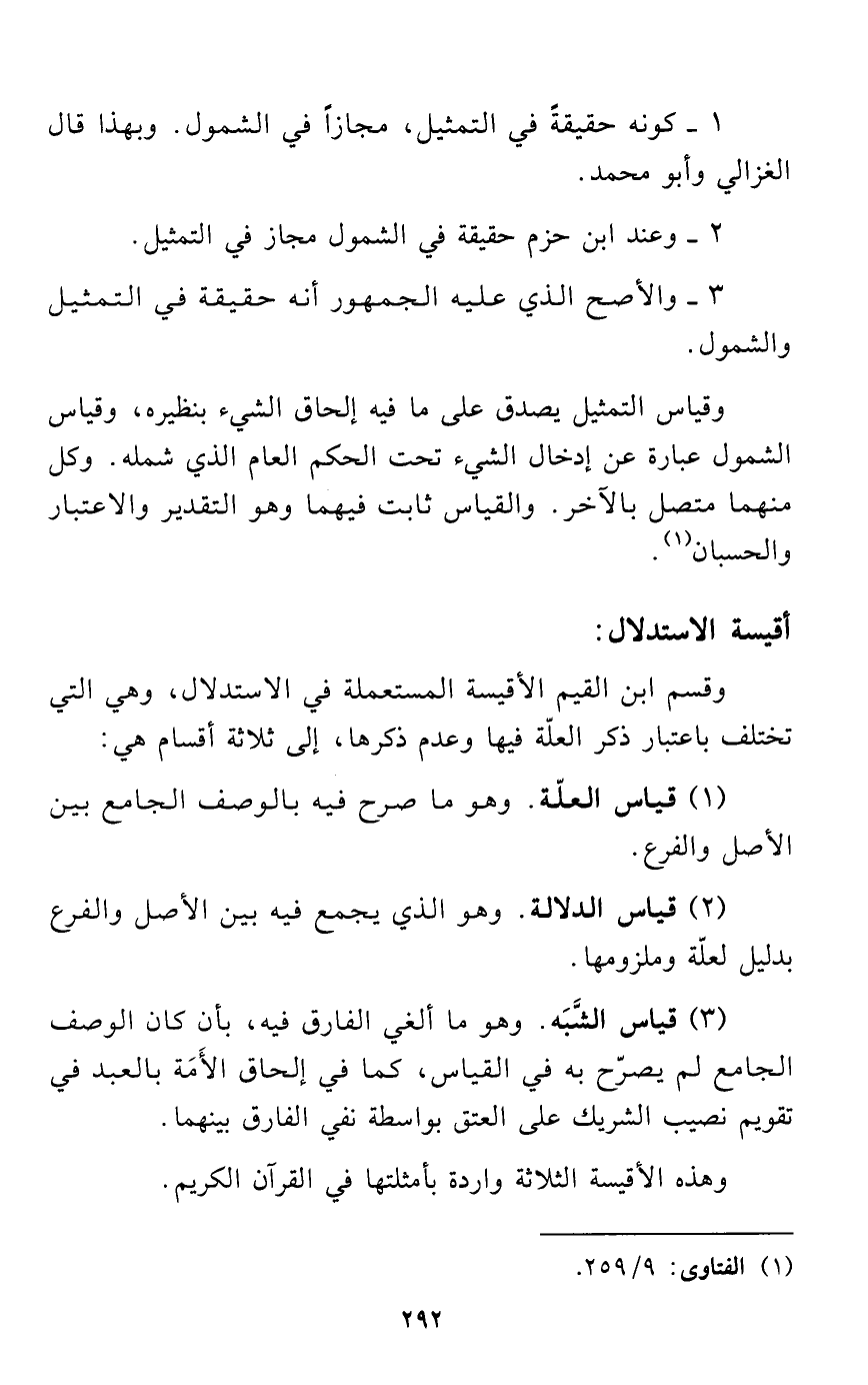 وقياس التمثيل يصدق على ما فيه إلحاق الشيء بنظيره، وقياس الشمول عبارة عن إدخال الشيء تحت الحكم العام الذي شمله. وكل منهما متصل بالآخر. والقياس ثابت فيهما وهو التقدير والاعتبار والحسبان (¬1).