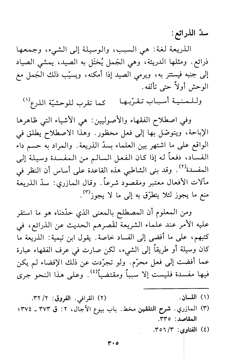 ومن المعلوم أن المصطلح بالمعنى الذي حدّدناه هو ما استقر عليه الأمر عند علماء الشريعة لقَصرهم الحديث عن الذرائع، في كتبهم، على ما أفضى إلى الفساد خاصة. يقول ابن تيمية: الذريعة ما كان وسيلة أو طريقاً إلى الشيء، لكن صارت في عرف الفقهاء عبارة عما أفضت إلى فعل محرّم. ولو تجرّدت عن ذلك الإفضاء لم يكن فيها مفسدة فليست إلا سبباً ومقتضياً (¬4). وعلى هذا النحو جرى