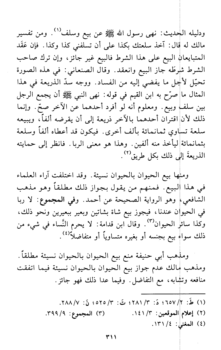 ومذهب أبي حنيفة منع بيع الحيوان بالحيوان نسيئة مطلقاً. ومذهب مالك عدم جواز بيع الحيوان بالحيوان نسيئة فيما اتفقت منافعه وتشابه، مع التفاضل. وفيما عدا ذلك فهو جائز.