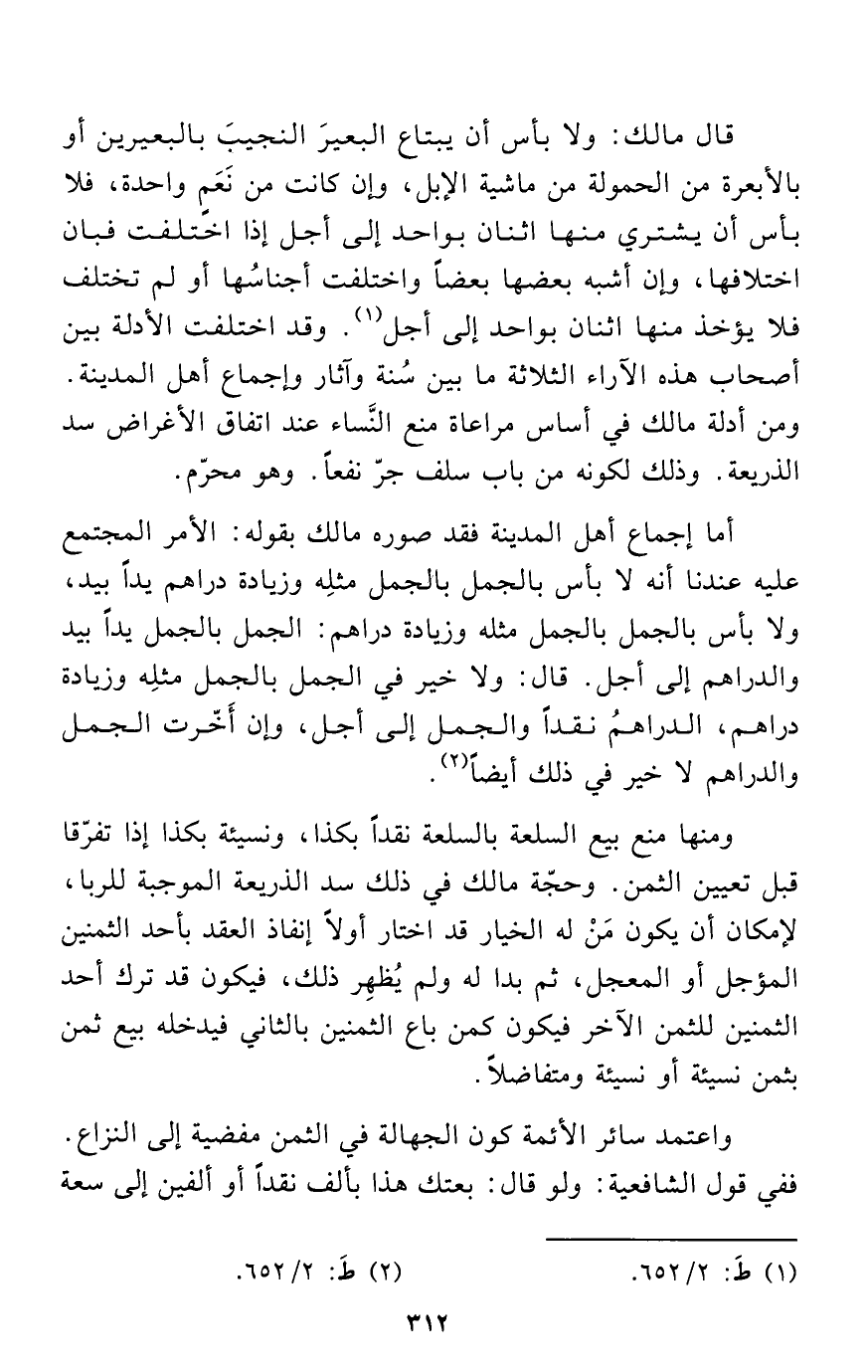 قال مالك: ولا بأس أن يبتاع البعيرَ النجيبَ بالبعيرين أو بالأبعرة من الحمولة من ماشية الإبل، وإن كانت من نَعَم واحدة، فلا بأس أن يشتري منها اثنان بواحد إلى أجل إذا اختلفت فبان اختلافها، وإن أشبه بعضها بعضاً واختلفت أجناسُها أو لم تختلف فلا يؤخذ منها اثنان بواحد إلى أجل (¬1). وقد اختلفت الأدلة بين أصحاب هذه الآراء الثلاثة ما بين سُنة وآثار وإجماع أهل المدينة. ومن أدلة مالك في أساس مراعاة منع النَّساء عند اتفاق الأغراض سد الذريعة. وذلك لكونه من باب سلف جرّ نفعاً. وهو محرّم.
