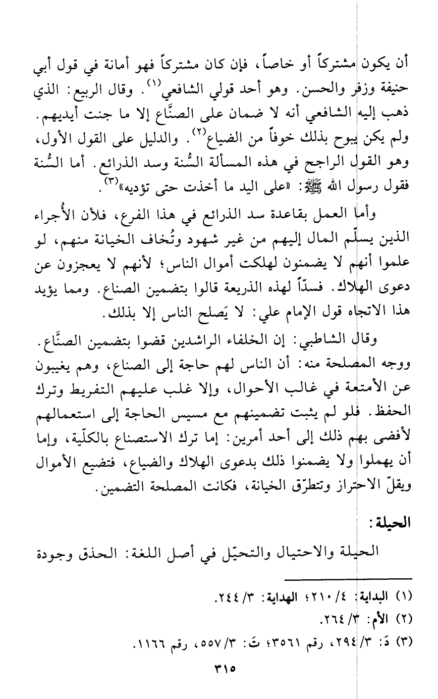وقال الشاطبي: إن الخلفاء الراشدين قضوا بتضمين الصنَّاع. ووجه المصلحة منه: أن الناس لهم حاجة إلى الصناع، وهم يغيبون عن الأمتعة في غالب الأحوال، وإلا غلب عليهم التفريط وترك الحفظ. فلو لم يثبت تضمينهم مع مسيس الحاجة إلى استعمالهم لأفضى بهم ذلك إلى أحد أمرين: إما ترك الاستصناع بالكلّية، وإما أن يهملوا ولا يضمنوا ذلك بدعوى الهلاك والضياع، فتضيع الأموال ويقلّ الاحتراز وتتطرّق الخيانة، فكانت المصلحة التضمين.