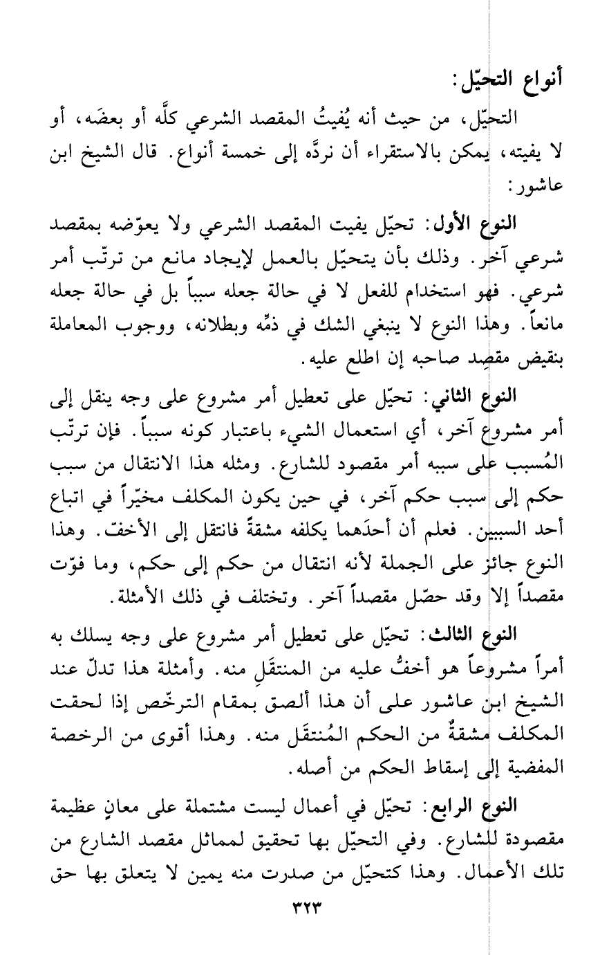 النوع الثالث: تحيّل على تعطيل أمر مشروع على وجه يسلك به أمراً مشروعاً هو أخفُّ عليه من المنتقَلِ منه. وأمثلة هذا تدلّ عند الشيخ ابن عاشور على أن هذا ألصق بمقام الترخّص إذا لحقت المكلف مشقةٌ من الحكم المُنتقَل منه. وهذا أقوى من الرخصة المفضية إلى إسقاط الحكم من أصله.