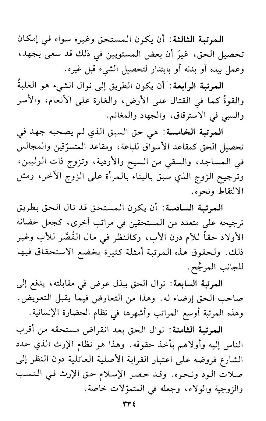 المرتبة الثامنة: نوال الحق بعد انقراض مستحقه من أقرب الناس إليه وأولاهم بأخذ حقوقه. وهذا هو نظام الإرث الذي حدد الشارع فروضه على اعتبار القرابة الأصلية العائلية دون النظر إلى صلات الود ونحوه. وقد حصر الإسلام حق الإرث في النسب والزوجية والولاء، وجعله في المتموّلات خاصة.