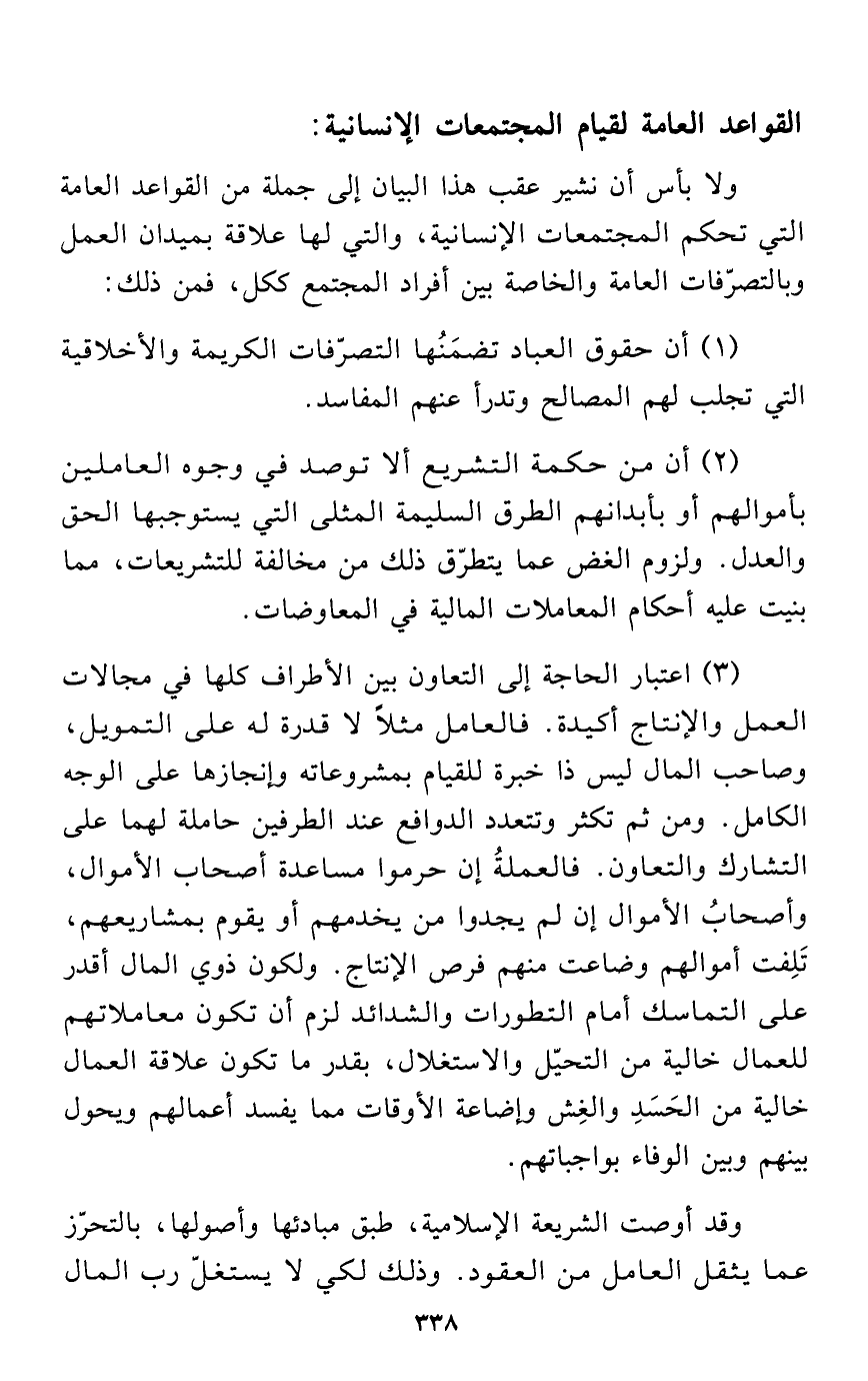 ولا بأس أن نشير عقب هذا البيان إلى جملة من القواعد العامة التي تحكم المجتمعات الإنسانية، والتي لها علاقة بميدان العمل وبالتصرّفات العامة والخاصة بين أفراد المجتمع ككل، فمن ذلك: