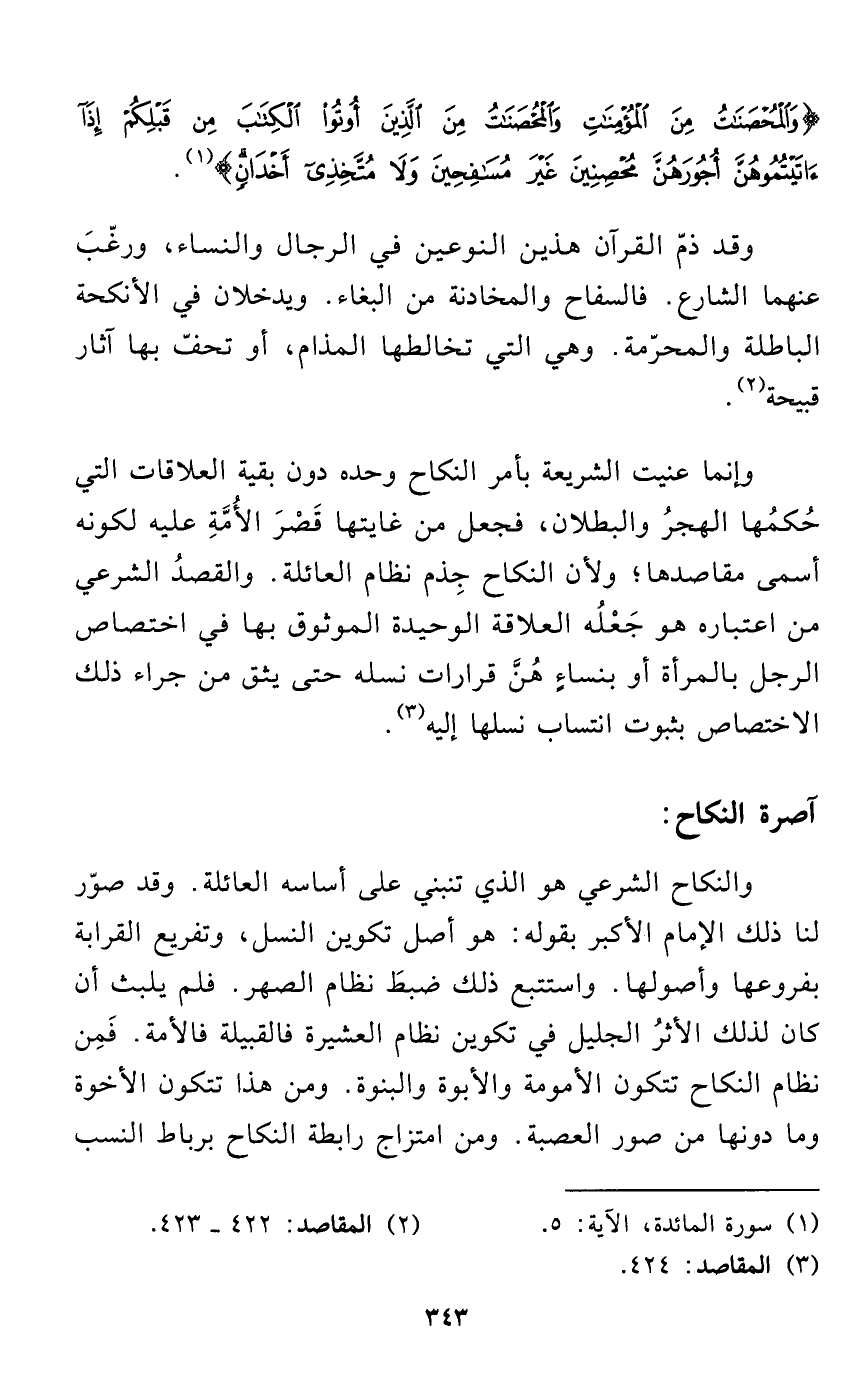 وإنما عنيت الشريعة بأمر النكاح وحده دون بقية العلاقات التي حُكمُها الهجرُ والبطلان، فجعل من غايتها قَصْرَ الأُمَّةِ عليه لكونه أسمى مقاصدها؛ ولأن النكاح جِذم نظام العائلة. والقصدُ الشرعي من اعتباره هو جَعْلُه العلاقة الوحيدة الموثوق بها في اختصاص الرجل بالمرأة أو بنساءٍ هُنَّ قرارات نسله حتى يثق من جراء ذلك الاختصاص بثبوت انتساب نسلها إليه (¬3).