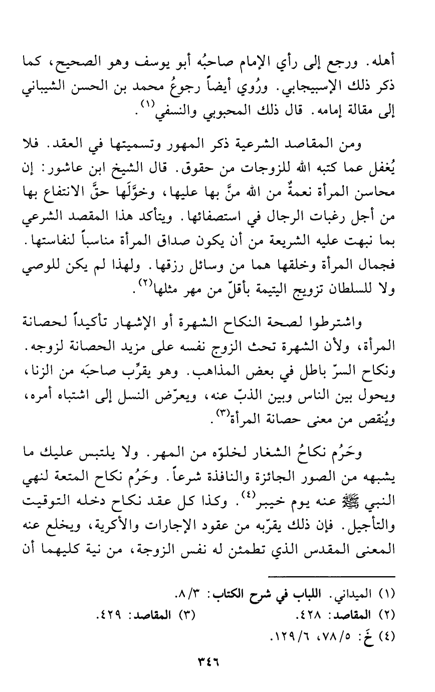 ومن المقاصد الشرعية ذكر المهور وتسميتها في العقد. فلا يُغفل عما كتبه الله للزوجات من حقوق. قال الشيخ ابن عاشور: إن محاسن المرأة نعمةٌ من الله منَّ بها عليها، وخوَّلَها حقَّ الانتفاع بها من أجل رغبات الرجال في استصفائها. ويتأكد هذا المقصد الشرعي بما نبهت عليه الشريعة من أن يكون صداق المرأة مناسباً لنفاستها. فجمال المرأة وخلقها هما من وسائل رزقها. ولهذا لم يكن للوصي ولا للسلطان تزويج اليتيمة بأقلّ من مهر مثلها (¬2).