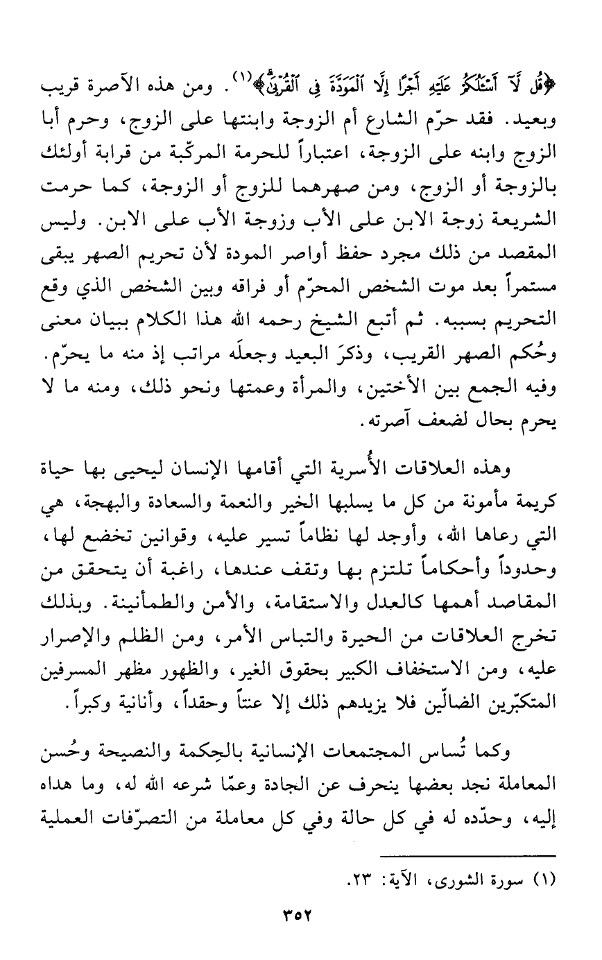 {قُلْ لَا أَسْأَلُكُمْ عَلَيْهِ أَجْرًا إِلَّا الْمَوَدَّةَ فِي الْقُرْبَى} (¬1). ومن هذه الآصرة قريب وبعيد. فقد حرّم الشارع أم الزوجة وابنتها على الزوج، وحرم أبا الزوج وابنه على الزوجة، اعتباراً للحرمة المركّبة من قرابة أولئك بالزوجة أو الزوج، ومن صهرهما للزوج أو الزوجة، كما حرمت الشريعة زوجة الابن على الأب وزوجة الأب على الابن. وليس المقصد من ذلك مجرد حفظ أواصر المودة لأن تحريم الصهر يبقى مستمراً بعد موت الشخص المحرّم أو فراقه وبين الشخص الذي وقع التحريم بسببه. ثم أتبع الشيخ رحمه الله هذا الكلام ببيان معنى وحُكم الصهر القريب، وذكرَ البعيد وجعلَه مراتب إذ منه ما يحرّم. وفيه الجمع بين الأختين، والمرأة وعمتها ونحو ذلك، ومنه ما لا يحرم بحال لضعف آصرته.