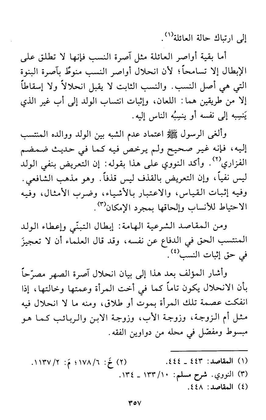 أما بقية أواصر العائلة مثل آصرة النسب فإنها لا تطلق على الإبطال إلا تسامحاً؛ لأن انحلال أواصر النسب منوطٌ بآصرة البنوة التي هي أصل النسب. والنسب الثابت لا يقبل انحلالاً ولا إسقاطاً إلا من طريقين هما: اللعان، وإثبات انتساب الولد إلى أب غير الذي يَنسِبه إلى نفسه أو ينسِبُه الناس إليه.