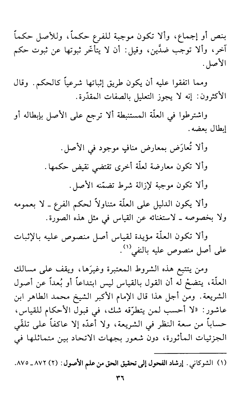 ومن يتتبع هذه الشروط المعتبرة وغيرَها، ويقف على مسالك العلّة، يتضحْ له أن القول بالقياس ليس ابتداعاً أو بُعداً عن أصول الشريعة. ومن أجل هذا قال الإمام الأكبر الشيخ محمد الطاهر ابن عاشور: "لا أحسب لمن يتطرّقه شك، في قبول الأحكام للقياس، حساباً من سعة النظر في الشريعة، ولا أعدّه إلا عاكفاً على تلقّي الجزئيات المأثورة، دون شعور بجهات الاتحاد بين متماثلها في