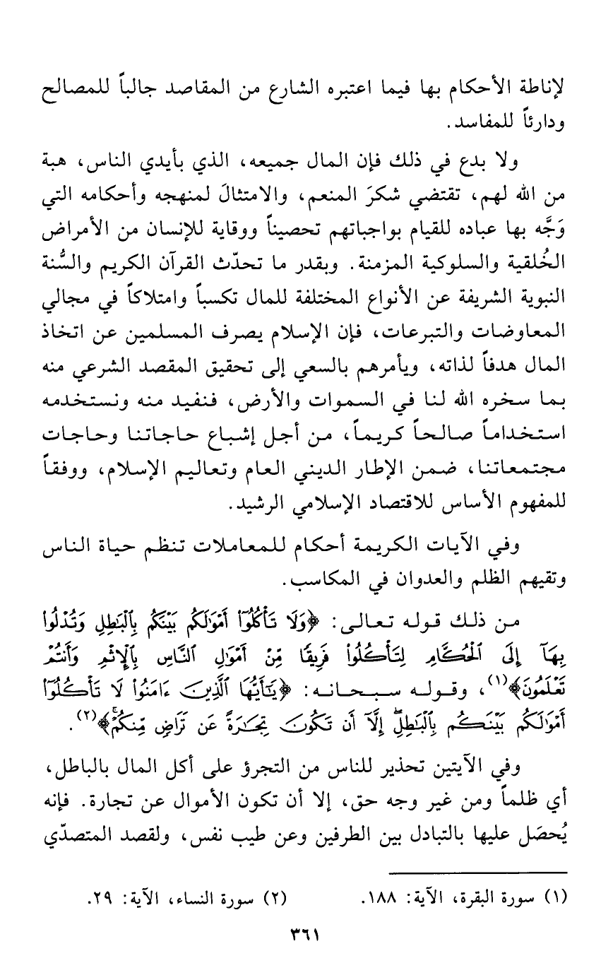 من ذلك قوله تعالى: {وَلَا تَأْكُلُوا أَمْوَالَكُمْ بَيْنَكُمْ بِالْبَاطِلِ وَتُدْلُوا بِهَا إِلَى الْحُكَّامِ لِتَأْكُلُوا فَرِيقًا مِنْ أَمْوَالِ النَّاسِ بِالْإِثْمِ وَأَنْتُمْ تَعْلَمُونَ} (¬1)، وقوله سبحانه: {يَا أَيُّهَا الَّذِينَ آمَنُوا لَا تَأْكُلُوا أَمْوَالَكُمْ بَيْنَكُمْ بِالْبَاطِلِ إِلَّا أَنْ تَكُونَ تِجَارَةً عَنْ تَرَاضٍ مِنْكُمْ} (¬2).