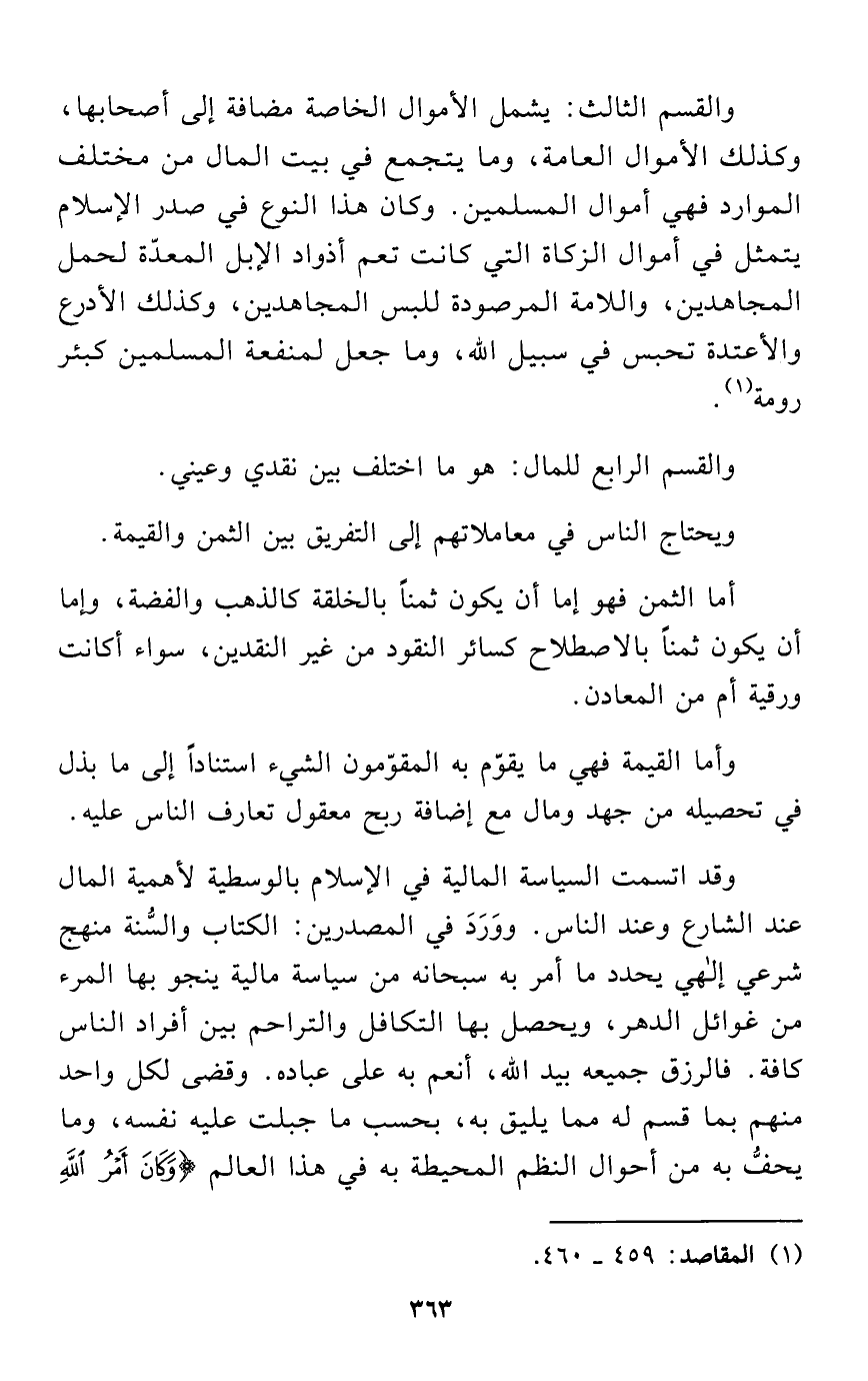 والقسم الثالث: يشمل الأموال الخاصة مضافة إلى أصحابها، وكذلك الأموال العامة، وما يتجمع في بيت المال من مختلف الموارد فهي أموال المسلمين. وكان هذا النوع في صدر الإسلام يتمثل في أموال الزكاة التي كانت تعم أذواد الإبل المعدّة لحمل المجاهدين، واللامة المرصودة للبس المجاهدين، وكذلك الأدرع والأعتدة تحبس في سبيل الله، وما جعل لمنفعة المسلمين كبئر رومة (¬1).