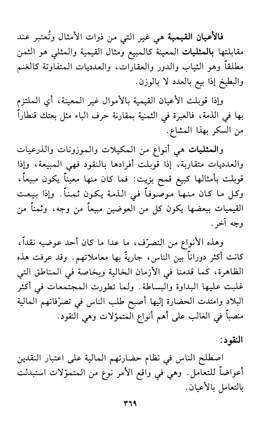 وهذه الأنواع من التصرّف، ما عدا ما كان أحد عوضيه نقداً، كانت أكثر دوراناً بين الناس، جاريةً بها معاملاتهم. وقد عرفت هذه الظاهرة، كما قدمنا في الأزمان الخالية وبخاصة في المناطق التي غلبت عليها البداوة والبساطة. ولما تطورت المجتمعات في أكثر البلاد وامتدت الحضارة إليها أصبح طلب الناس في تصرّفاتهم المالية منصباً في الغالب على أهم أنواع المتموّلات وهي النقود.