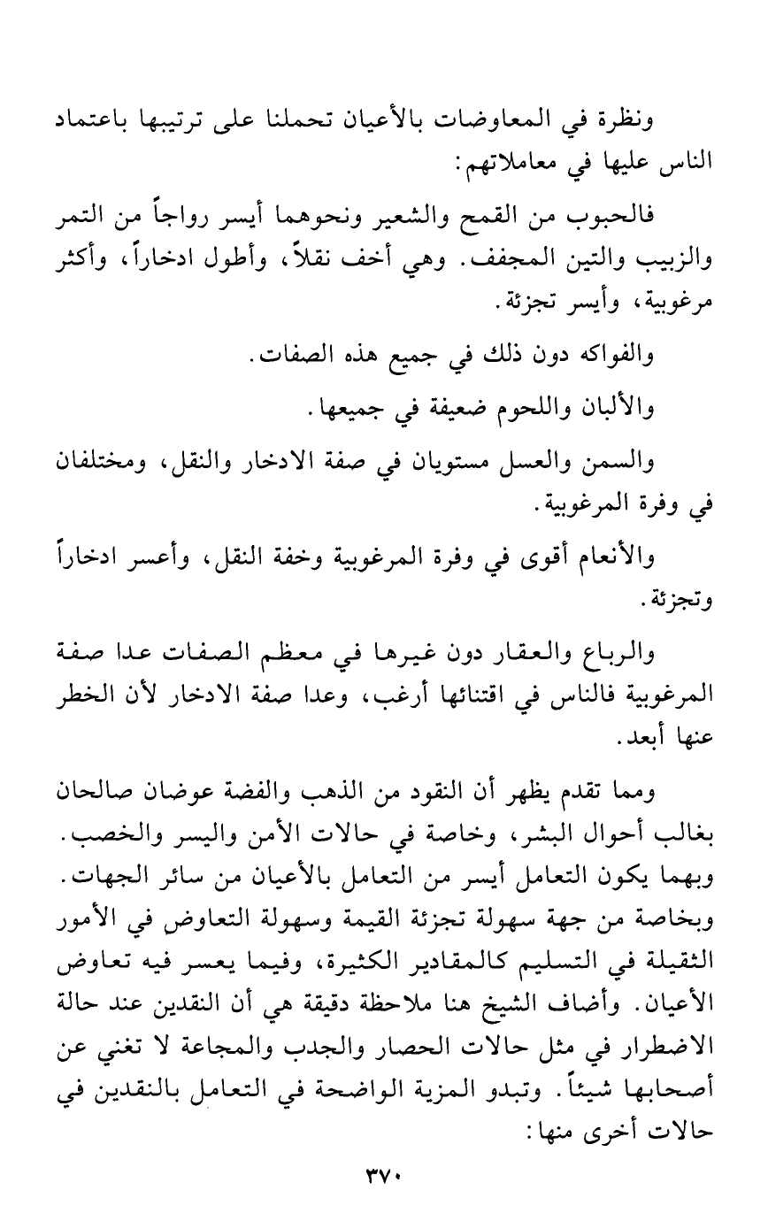 ومما تقدم يظهر أن النقود من الذهب والفضة عوضان صالحان بغالب أحوال البشر، وخاصة في حالات الأمن واليسر والخصب. وبهما يكون التعامل أيسر من التعامل بالأعيان من سائر الجهات. وبخاصة من جهة سهولة تجزئة القيمة وسهولة التعاوض في الأمور الثقيلة في التسليم كالمقادير الكثيرة، وفيما يعسر فيه تعاوض الأعيان. وأضاف الشيخ هنا ملاحظة دقيقة هي أن النقدين عند حالة الاضطرار في مثل حالات الحصار والجدب والمجاعة لا تغني عن أصحابها شيئاً. وتبدو المزية الواضحة في التعامل بالنقدين في حالات أخرى منها: