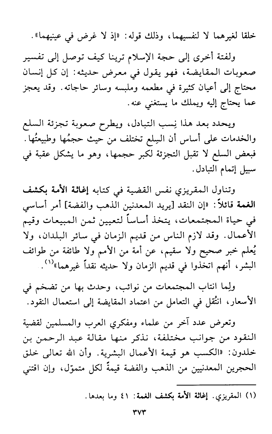 وتناول المقريزي نفس القضية في كتابه إغاثة الأمة بكشف الغمة قائلاً: "إن النقد [يريد المعدنين الذهب والفضة] أمر أساسي في حياة المجتمعات، يتخذ أساساً لتعيين ثمن المبيعات وقيم الأعمال. وقد لازم الناس من قديم الزمان في سائر البلدان، ولا يُعلم خبر صحيح ولا سقيم، عن أمة من الأمم ولا طائفة من طوائف البشر، أنهم اتخذوا في قديم الزمان ولا حديثه نقداً غيرهما" (¬1).