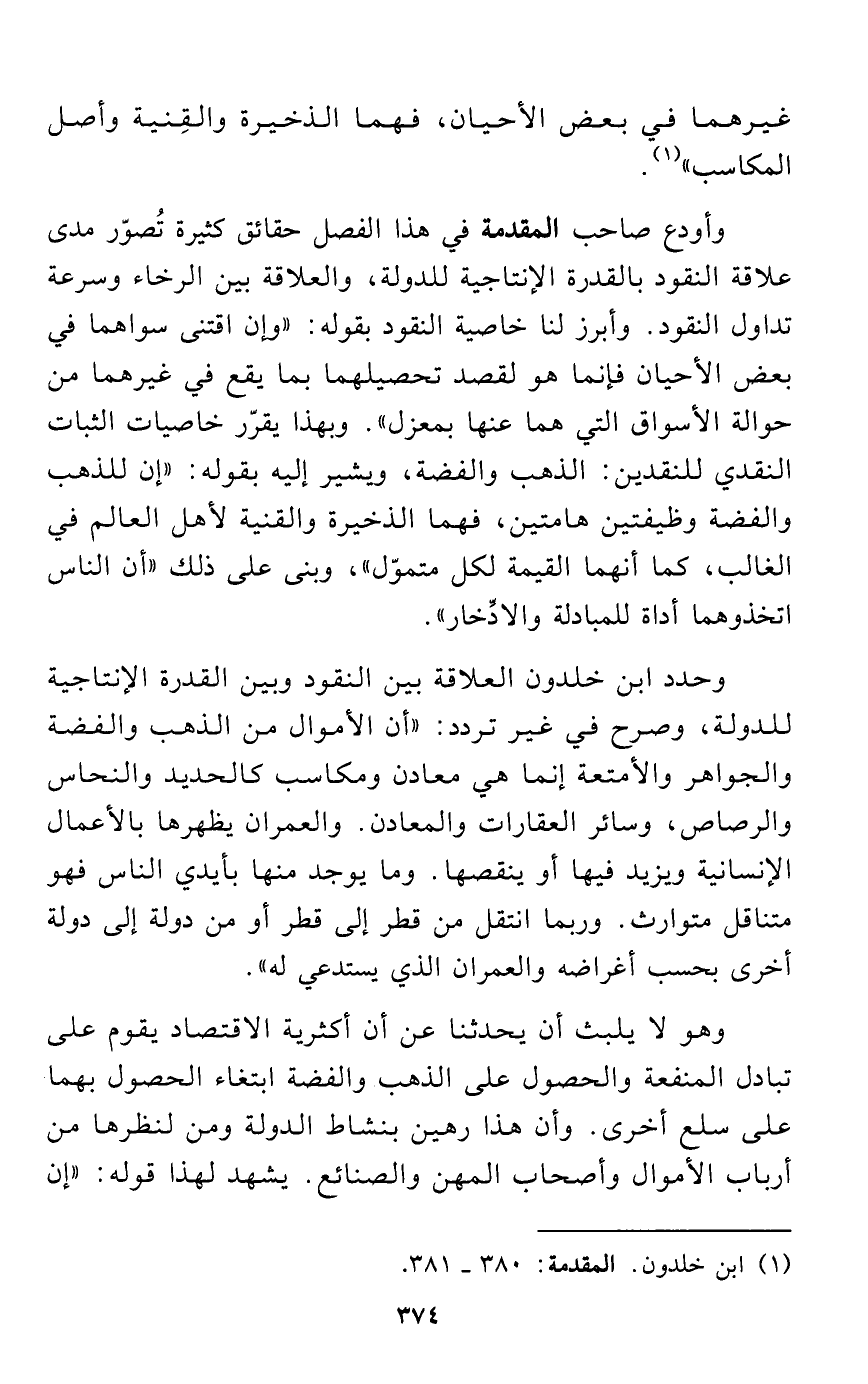 وأودع صاحب المقدمة في هذا الفصل حقائق كثيرة تُصوّر مدى علاقة النقود بالقدرة الإنتاجية للدولة، والعلاقة بين الرخاء وسرعة تداول النقود. وأبرز لنا خاصية النقود بقوله: "وإن اقتنى سواهما في بعض الأحيان فإنما هو لقصد تحصيلهما بما يقع في غيرهما من حوالة الأسواق التي هما عنها بمعزل". وبهذا يقرّر خاصيات الثبات النقدي للنقدين: الذهب والفضة، ويشير إليه بقوله: "إن للذهب والفضة وظيفتين هامتين، فهما الذخيرة والقنية لأهل العالم في الغالب، كما أنهما القيمة لكل متموّل"، وبنى على ذلك "أن الناس اتخذوهما أداة للمبادلة والادِّخار".