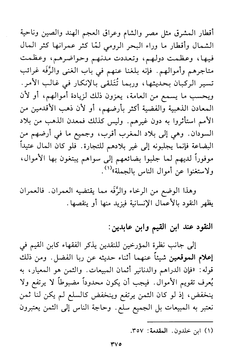أقطار المشرق مثل مصر والشام وعراق العجم الهند والصين وناحية الشمال وأقطار ما وراء البحر الرومي لمّا كثر عمرانها كثر المال فيها، وعظمت دولهم، وتعددت مدنهم وحواضرهم، وعظمت متاجرهم وأموالهم. فإنه بلغنا عنهم في باب الغنى والرَّفَه غرائب تسير الركبان بحديثها، وربما تُتَلقى بالإنكار في غالب الأمر. ويحسب ما يسمع من العامة، يعزون ذلك لزيادة أموالهم، أو لأن المعادن الذهبية والفضية أكثر بأرضهم، أو لأن ذهب الأقدمين من الأمم استأثروا به دون غيرهم. وليس كذلك فمعدن الذهب من بلاد السودان. وهي إلى بلاد المغرب أقرب، وجميع ما في أرضهم من البضاعة فإنما يجلبونه إلى غير بلادهم للتجارة. فلو كان المال عتيداً موفوراً لديهم لما جلبوا بضائعهم إلى سواهم يبتغون بها الأموال، ولاستغنوا عن أموال الناس بالجملة" (¬1).