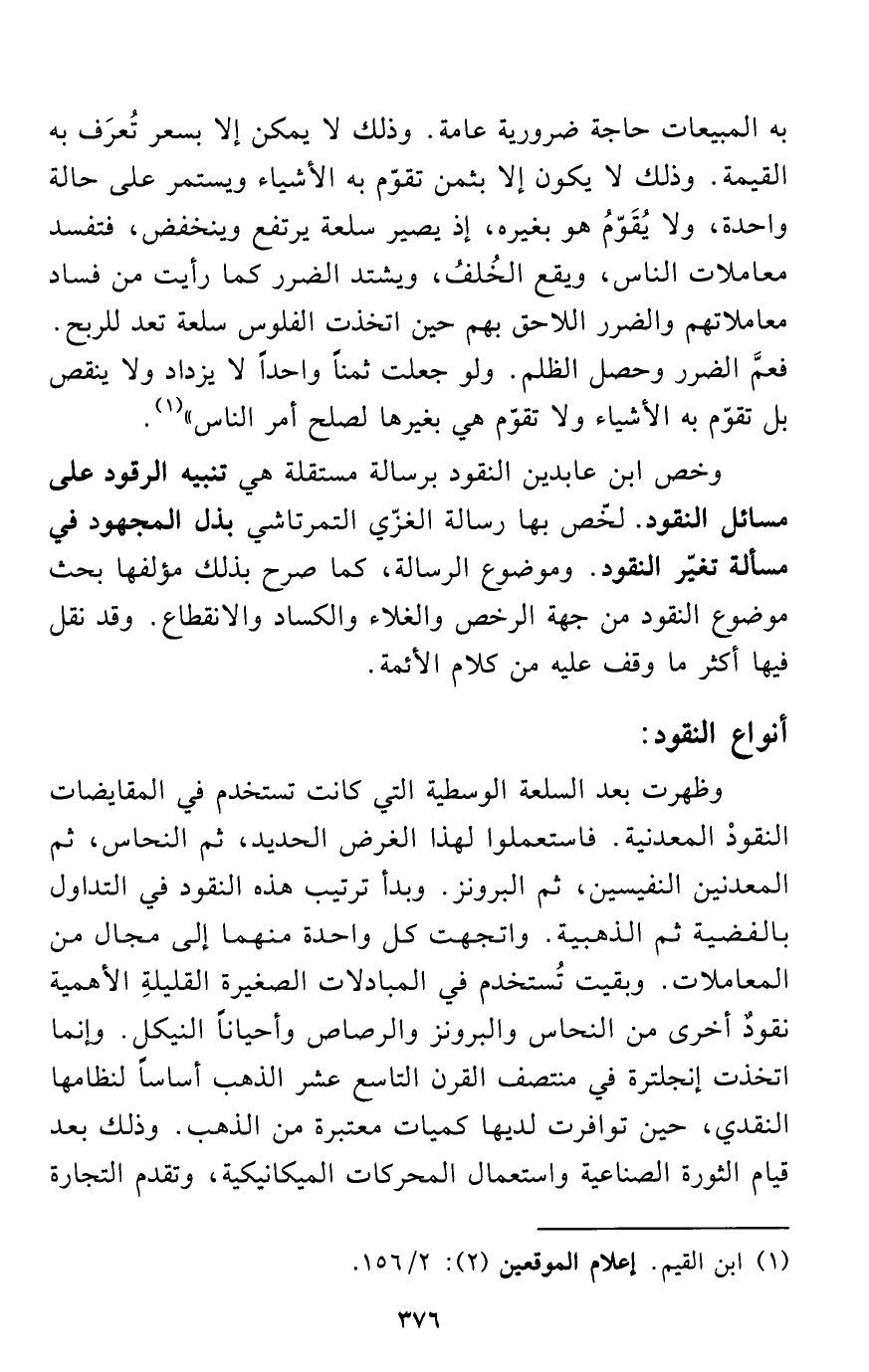 به المبيعات حاجة ضرورية عامة. وذلك لا يمكن إلا بسعر تُعرَف به القيمة. وذلك لا يكون إلا بثمن تقوّم به الأشياء ويستمر على حالة واحدة، ولا يُقَوّمُ هو بغيره، إذ يصير سلعة يرتفع وينخفض، فتفسد معاملات الناس، ويقع الخُلفُ، ويشتد الضرر كما رأيت من فساد معاملاتهم والضرر اللاحق بهم حين اتخذت الفلوس سلعة تعد للربح. فعمَّ الضرر وحصل الظلم. ولو جعلت ثمناً واحداً لا يزداد ولا ينقص بل تقوّم به الأشياء ولا تقوّم هي بغيرها لصلح أمر الناس" (¬1).