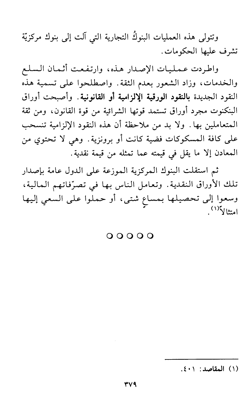 واطردت عمليات الإصدار هذه، وارتفعت أثمان السلع والخدمات، وزاد الشعور بعدم الثقة. واصطلحوا على تسمية هذه النقود الجديدة بالنقود الورقية الإلزامية أو القانونية. وأصبحت أوراق البنكنوت مجرد أوراق تستمد قوتها الشرائية من قوة القانون، ومن ثقة المتعاملين بها. ولا بد من ملاحظة أن هذه النقود الإلزامية تنسحب على كافة المسكوكات فضية كانت أو برونزية. وهي لا تحتوي من المعادن إلا ما يقل في قيمته عما تمثله من قيمة نقدية.