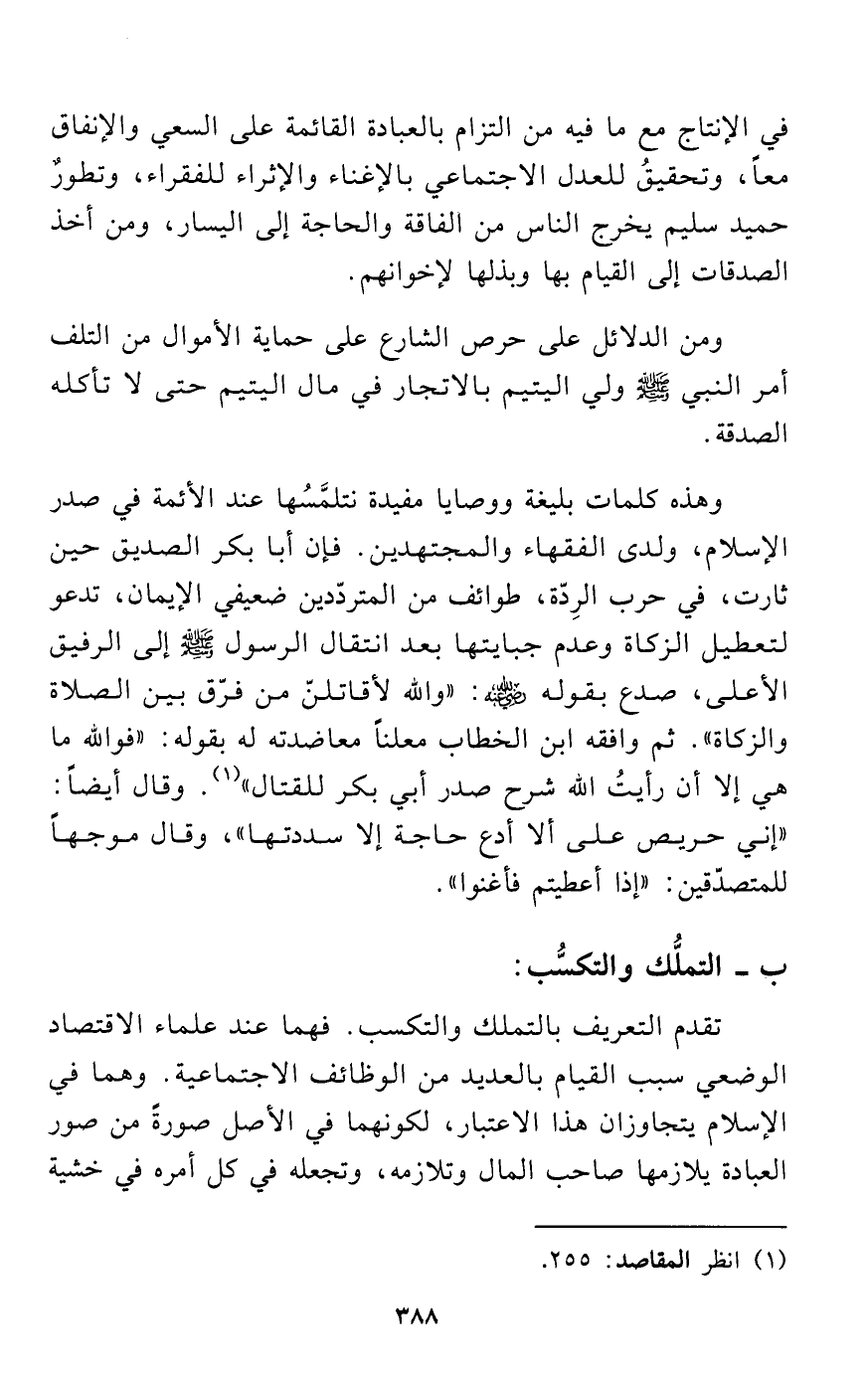 في الإنتاج مع ما فيه من التزام بالعبادة القائمة على السعي والإنفاق معاً، وتحقيقُ للعدل الاجتماعي بالإغناء والإثراء للفقراء، وتطورٌ حميد سليم يخرج الناس من الفاقة والحاجة إلى اليسار، ومن أخذ الصدقات إلى القيام بها وبذلها لإخوانهم.