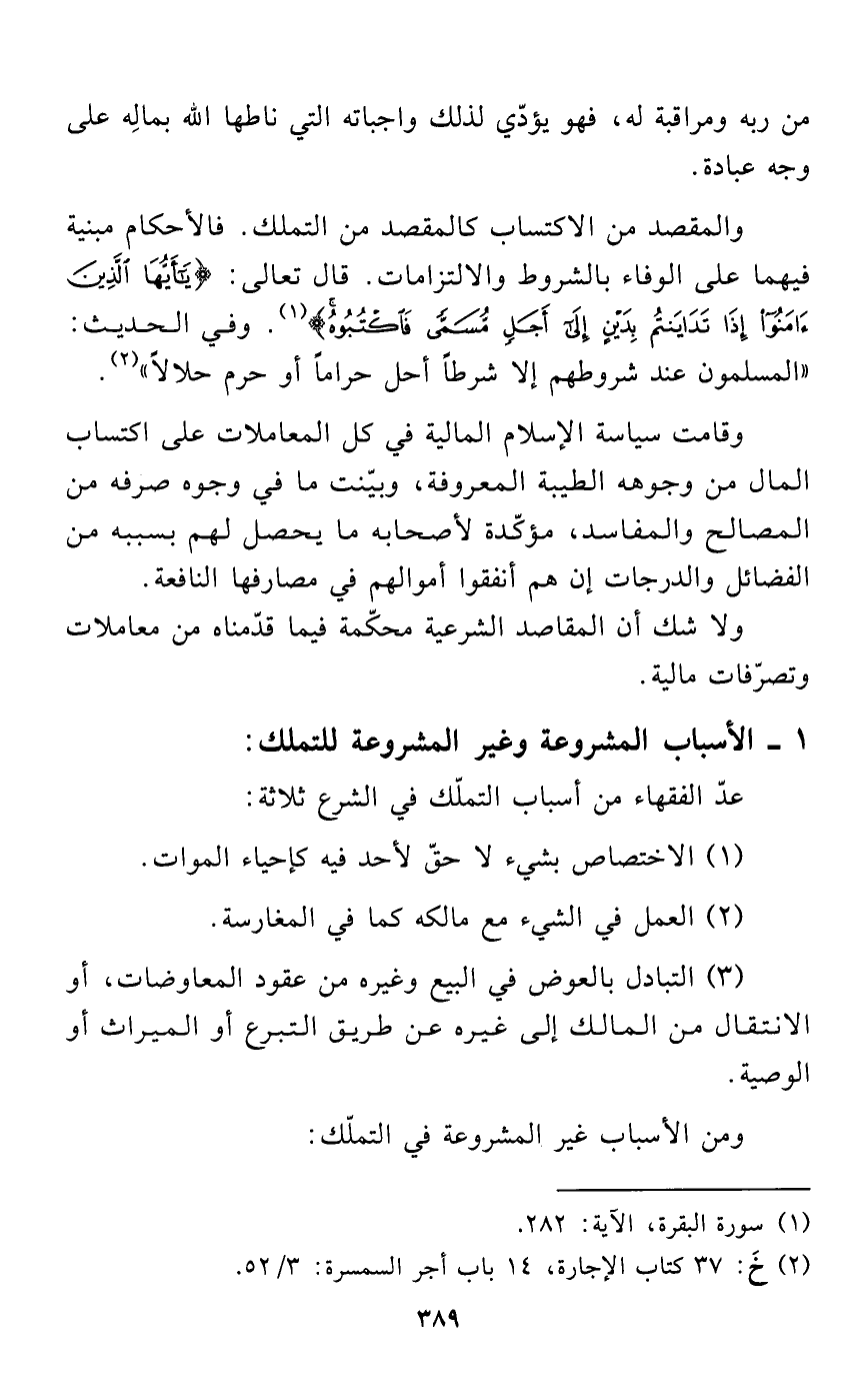 والمقصد من الاكتساب كالمقصد من التملك. فالأحكام مبنية فيهما على الوفاء بالشروط والالتزامات. قال تعالى: {يَا أَيُّهَا الَّذِينَ آمَنُوا إِذَا تَدَايَنْتُمْ بِدَيْنٍ إِلَى أَجَلٍ مُسَمًّى فَاكْتُبُوهُ} (¬1). وفي الحديث: "المسلمون عند شروطهم إلا شرطاً أحل حراماً أو حرم حلالاً" (¬2).