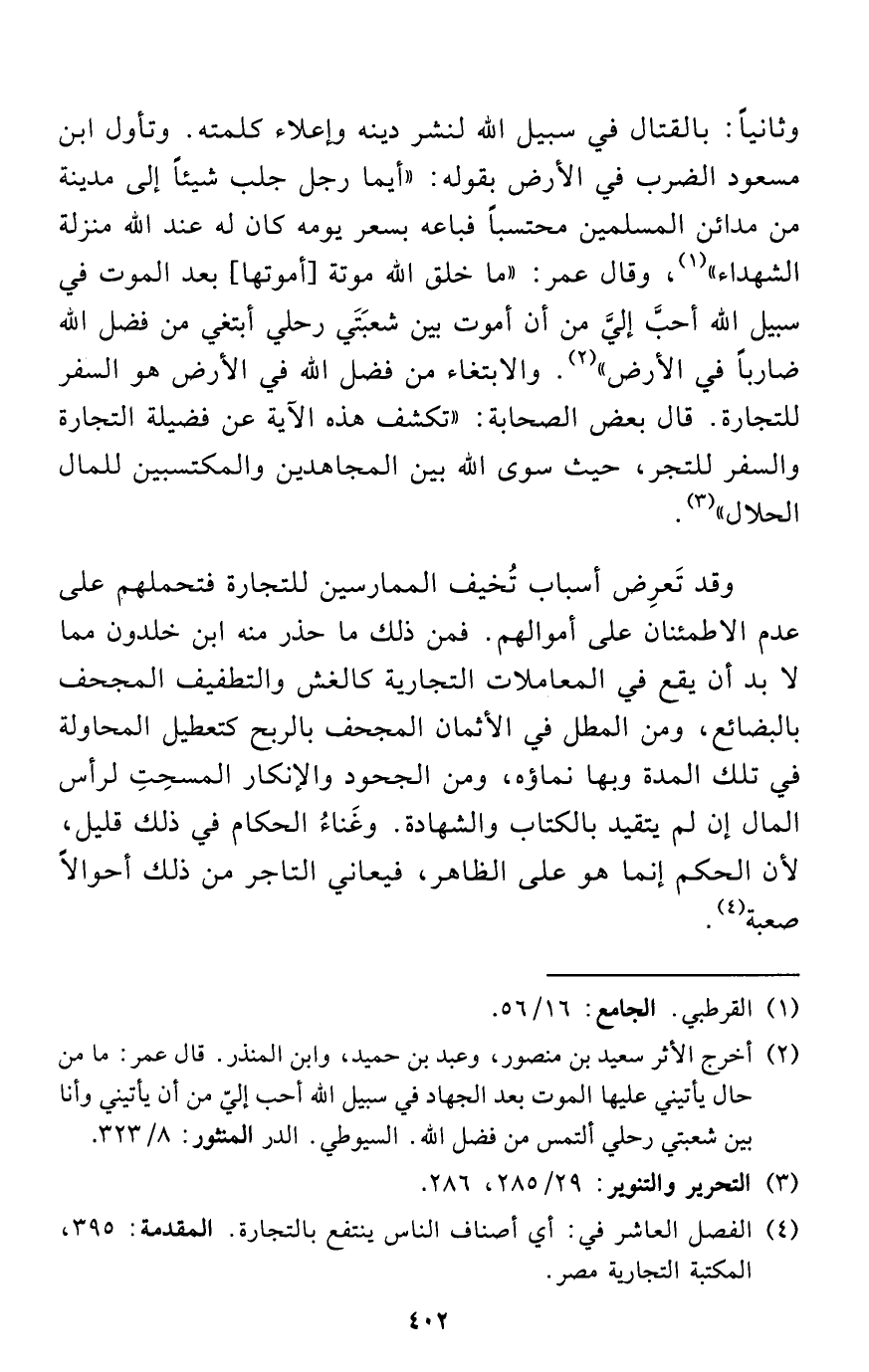 وثانياً: بالقتال في سبيل الله لنشر دينه وإعلاء كلمته. وتأول ابن مسعود الضرب في الأرض بقوله: "أيما رجل جلب شيئاً إلى مدينة من مدائن المسلمين محتسباً فباعه بسعر يومه كان له عند الله منزلة الشهداء" (¬1)، وقال عمر: "ما خلق الله موتة [أموتها] بعد الموت في سبيل الله أحبَّ إليَّ من أن أموت بين شعبَتَي رحلي أبتغي من فضل الله ضارباً في الأرض" (¬2). والابتغاء من فضل الله في الأرض هو السفر للتجارة. قال بعض الصحابة: "تكشف هذه الآية عن فضيلة التجارة والسفر للتجر، حيث سوى الله بين المجاهدين والمكتسبين للمال الحلال" (¬3).