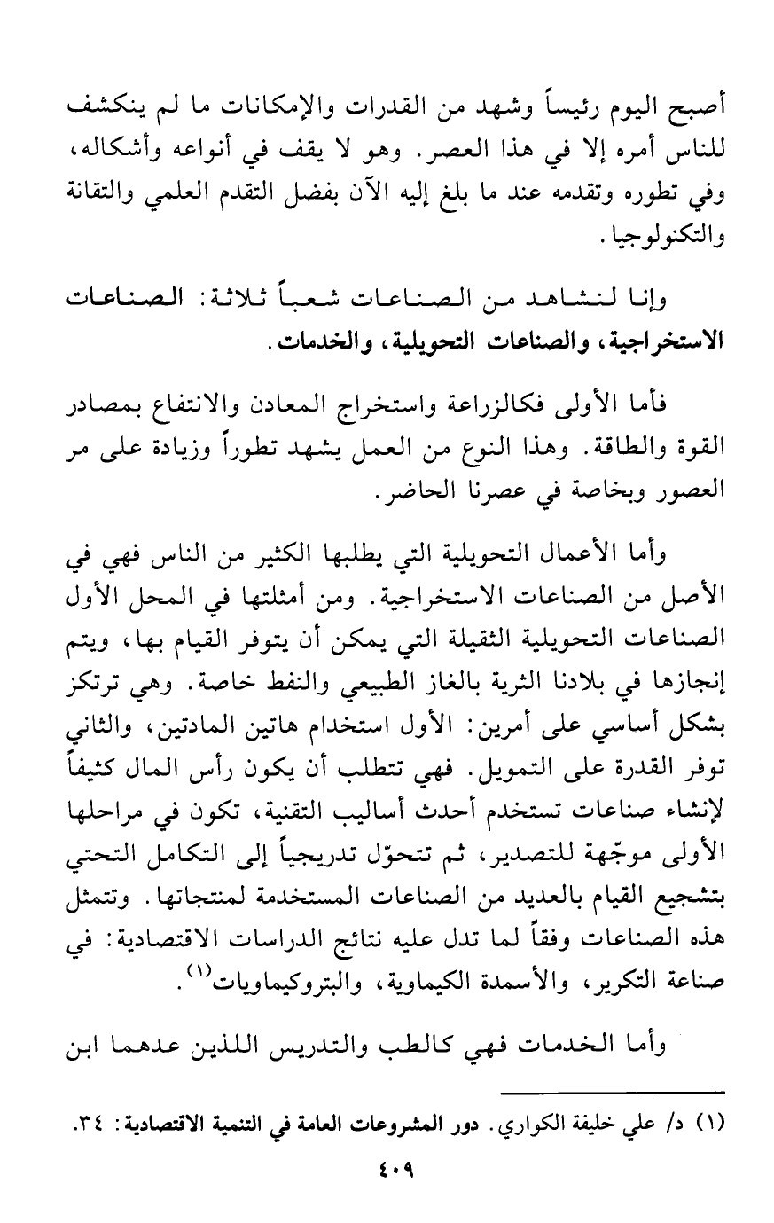 وإنا لنشاهد من الصناعات شعباً ثلاثة: الصناعات الاستخراجية، والصناعات التحويلية، والخدمات.