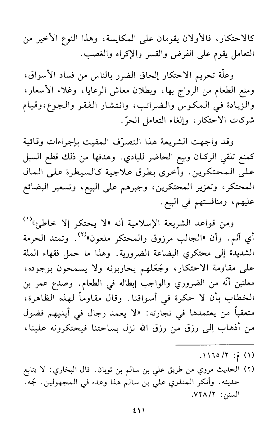 ومن قواعد الشريعة الإسلامية أنه "لا يحتكر إلا خاطئ" (¬1) أي آثم. وأن "الجالب مرزوق والمحتكر ملعون" (¬2). وتمتد الحرمة الشديدة إلى محتكري البضاعة الضرورية. وهذا ما حمل فقهاء الملة على مقاومة الاحتكار، وجَعَلهم يحاربونه ولا يسمحون بوجوده، معلنين أنّه من الضروري والواجب إبطاله في الطعام. وصدع عمر بن الخطاب بأن لا حكرة في أسواقنا. وقال مقاوماً لهذه الظاهرة، متعقباً من يعتمدها في تجارته: "لا يعمد رجال في أيديهم فضول من أذهاب إلى رزق من رزق الله نزل بساحتنا فيحتكرونه علينا،