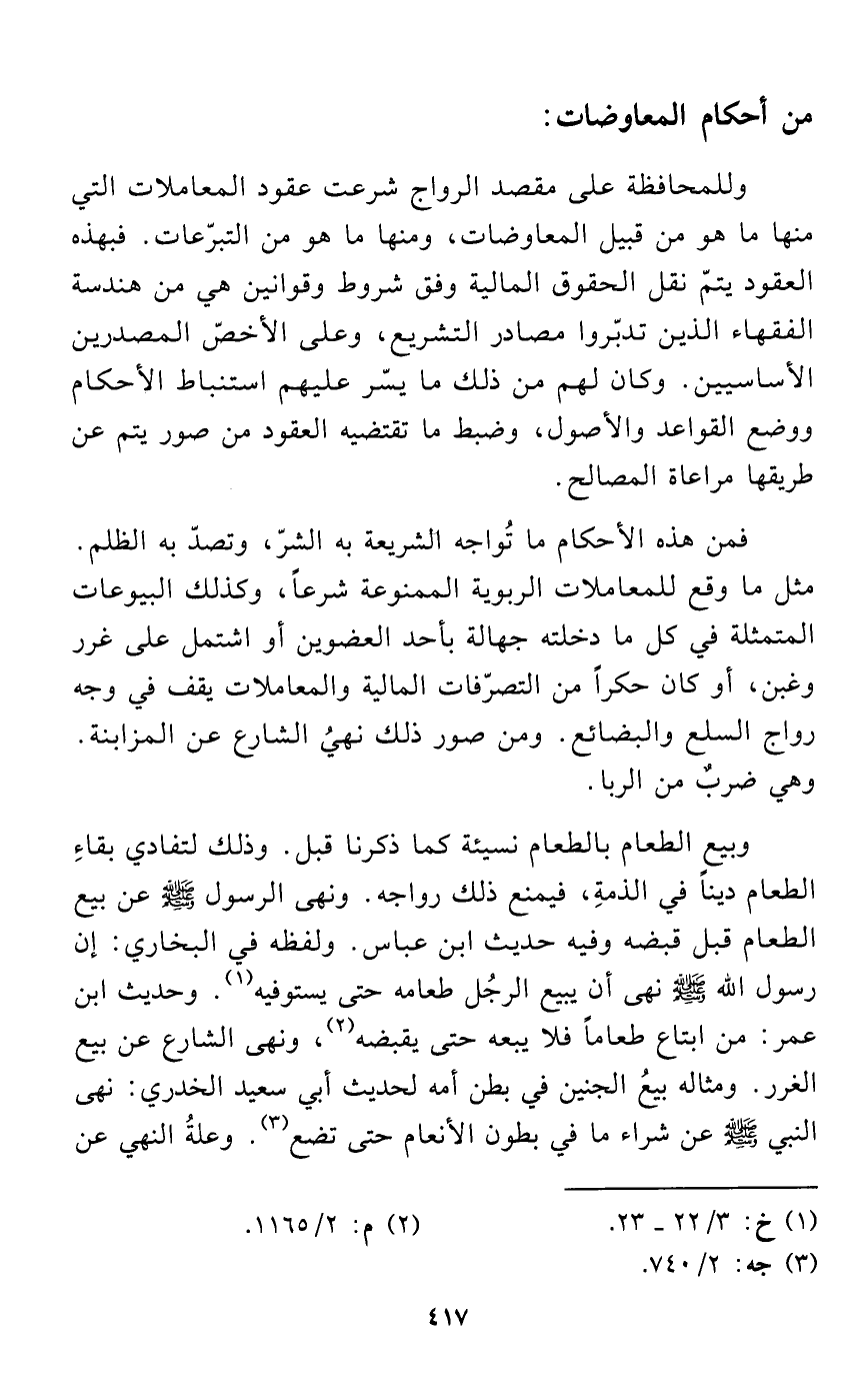 وبيع الطعام بالطعام نسيئة كما ذكرنا قبل. وذلك لتفادي بقاءِ الطعام ديناً في الذمةِ، فيمنع ذلك رواجه. ونهى الرسول - صلى الله عليه وسلم - عن بيع الطعام قبل قبضه وفيه حديث ابن عباس. ولفظه في البخاري: إن رسول الله - صلى الله عليه وسلم - نهى أن يبيع الرجُل طعامه حتى يستوفيه (¬1). وحديث ابن عمر: من ابتاع طعاماً فلا يبعه حتى يقبضه (¬2)، ونهى الشارع عن بيع الغرر. ومثاله بيعُ الجنين في بطن أمه لحديث أبي سعيد الخدري: نهى النبي - صلى الله عليه وسلم - عن شراء ما في بطون الأنعام حتى تضع (¬3). وعلةُ النهي عن