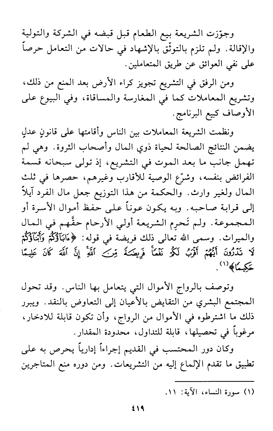 ونظمت الشريعة المعاملات بين الناس وأقامتها على قانونٍ عدلٍ يضمن النتائج الصالحة لحياة ذوي المال وأصحاب الثروة. وهي لم تهمل جانب ما بعد الموت في التشريع، إذ تولى سبحانه قسمة الفرائض بنفسه، وشرّع الوصية للأقارب وغيرهم، حصرها في ثلث المال ولغير وارث. والحكمة من هذا التوزيع جعل مال الفرد آيلاً إلى قرابة صاحبه. وبه يكون عوناً على حفظ أموال الأسرة أو المجموعة. ولم تَحرِم الشريعة أولي الأرحام حقَّهم في المال والميراث. وسمى الله تعالى ذلك فريضة في قوله: {آبَاؤُكُمْ وَأَبْنَاؤُكُمْ لَا تَدْرُونَ أَيُّهُمْ أَقْرَبُ لَكُمْ نَفْعًا فَرِيضَةً مِنَ اللَّهِ إِنَّ اللَّهَ كَانَ عَلِيمًا حَكِيمًا} (¬1).