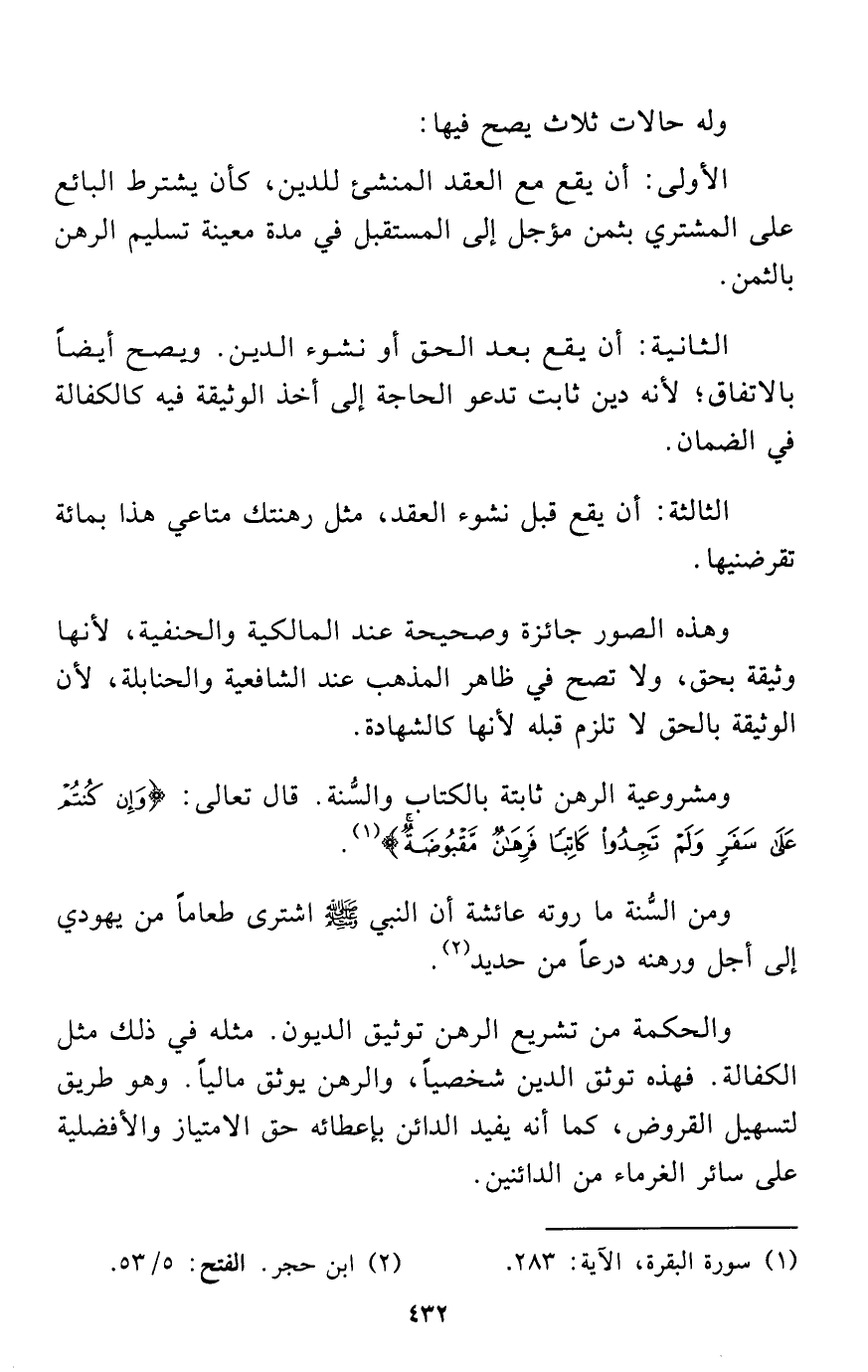 ومن السُّنة ما روته عائشة أن النبي - صلى الله عليه وسلم - اشترى طعاماً من يهودي إلى أجل ورهنه درعاً من حديد (¬2).