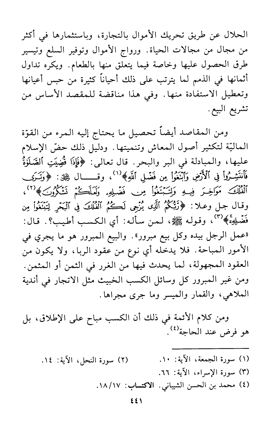 ومن المقاصد أيضاً تحصيل ما يحتاج إليه المرء من القوّة الماليّة لتكثير أصول المعاش وتنميتها. ودليل ذلك حضّ الإسلام عليها، والمبادلة في البر والبحر. قال تعالى: {فَإِذَا قُضِيَتِ الصَّلَاةُ فَانْتَشِرُوا فِي الْأَرْضِ وَابْتَغُوا مِنْ فَضْلِ اللَّهِ} (¬1)، وقال - عز وجل -: {وَتَرَى الْفُلْكَ مَوَاخِرَ فِيهِ وَلِتَبْتَغُوا مِنْ فَضْلِهِ وَلَعَلَّكُمْ تَشْكُرُونَ} (¬2)، وقال جل وعلا: {رَبُّكُمُ الَّذِي يُزْجِي لَكُمُ الْفُلْكَ فِي الْبَحْرِ لِتَبْتَغُوا مِنْ فَضْلِهِ} (¬3)، وقوله - صلى الله عليه وسلم -، لمن سأله: أي الكسب أطيب؟. قال: "عمل الرجل بيده وكل بيع مبرور". والبيع المبرور هو ما يجري في الأمور المباحة. فلا يدخله أي نوع من عقود الربا، ولا يكون من العقود المجهولة، لما يحدث فيها من الغرر في الثمن أو المثمن. ومن غير المبرور كل وسائل الكسب الخبيث مثل الاتجار في أندية الملاهي، والقمار والميسر وما جرى مجراها.