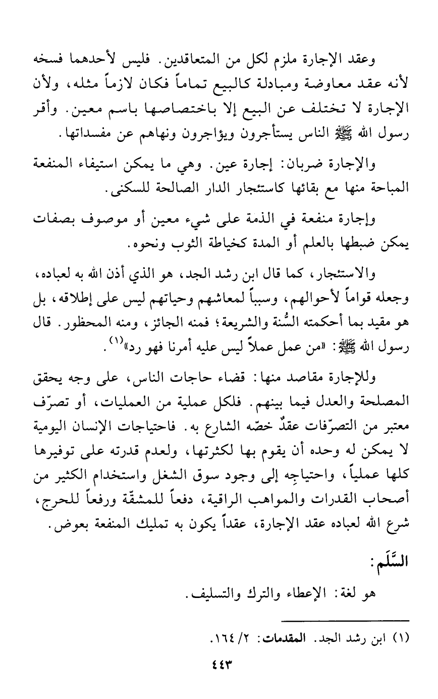 والاستئجار، كما قال ابن رشد الجد، هو الذي أذن الله به لعباده، وجعله قواماً لأحوالهم، وسبباً لمعاشهم وحياتهم ليس على إطلاقه، بل هو مقيد بما أحكمته السُّنة والشريعة؛ فمنه الجائز، ومنه المحظور. قال رسول الله - صلى الله عليه وسلم -: "من عمل عملاً ليس عليه أمرنا فهو رد" (¬1).